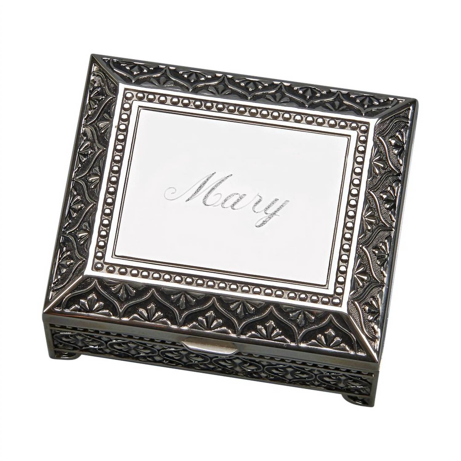 This 3" x 2.5" x 1.5" H rectangular box has an antique silver finish with lacquer to prevent tarnishing. The cover is hinged, and has a plain area in the center approximately 1.5" x 1.875" that can be used to engrave a special message, monogram or initial. The cover and box have a dark blue flocked cloth lining.