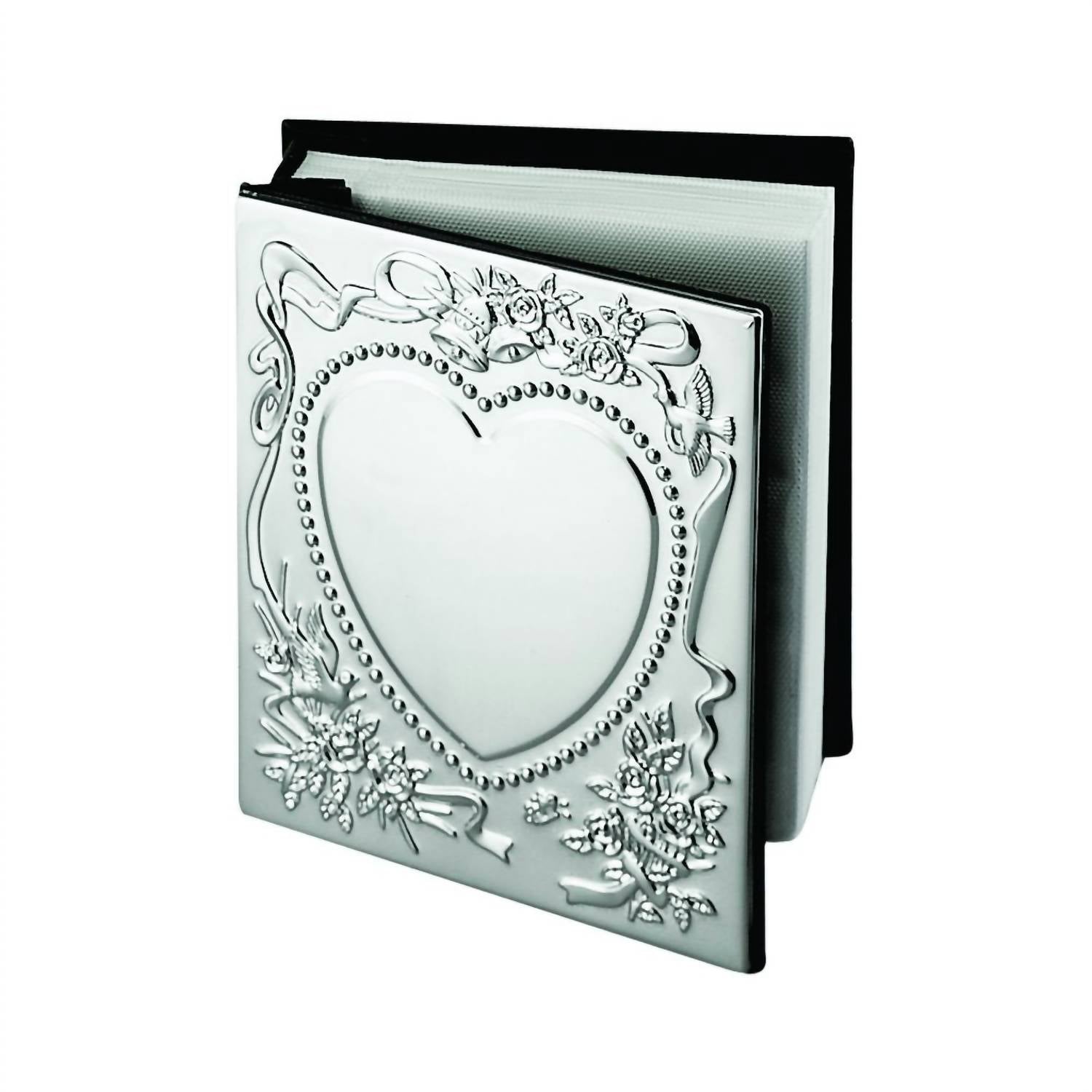 The cover features a raised beaded heart design in the center with bells, ribbon, roses and doves decorated around the heart. The bright silver finish is nickel plated and will not tarnish. The center of the heart can be engraved with the couples names and the date of the wedding. The inside front cover is lined with a dark blue flocking to match the back cover. The album holds up to 100 4" x 6" photos (50 pages) in clear non acid pages with white background. Measurements 6.5" x 5.75" x 2". Packed in green gift box.
