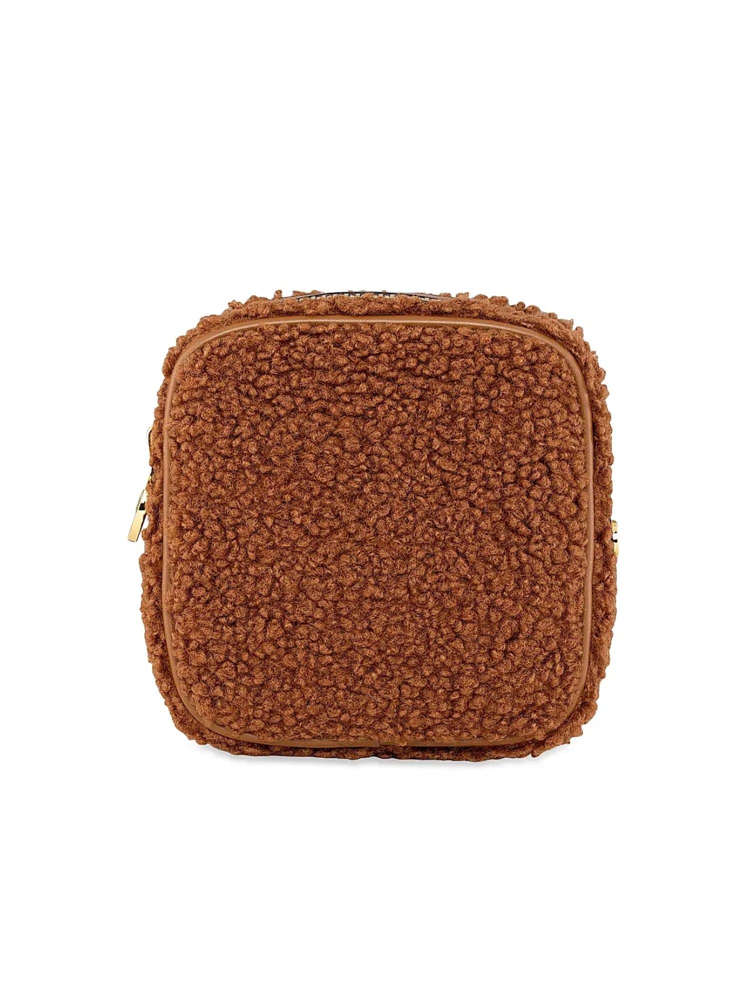 Stylish addition to your makeup organizing essentials. Crafted with a plush sherpa finish. Brown mini pouch features a convenient zip-around closure. Lining is made of durable nylon for added longevity, while its compact dimensions of approximately 4.75"W x 5"H x 2"D make it perfect for on-the-go use. Spot clean.