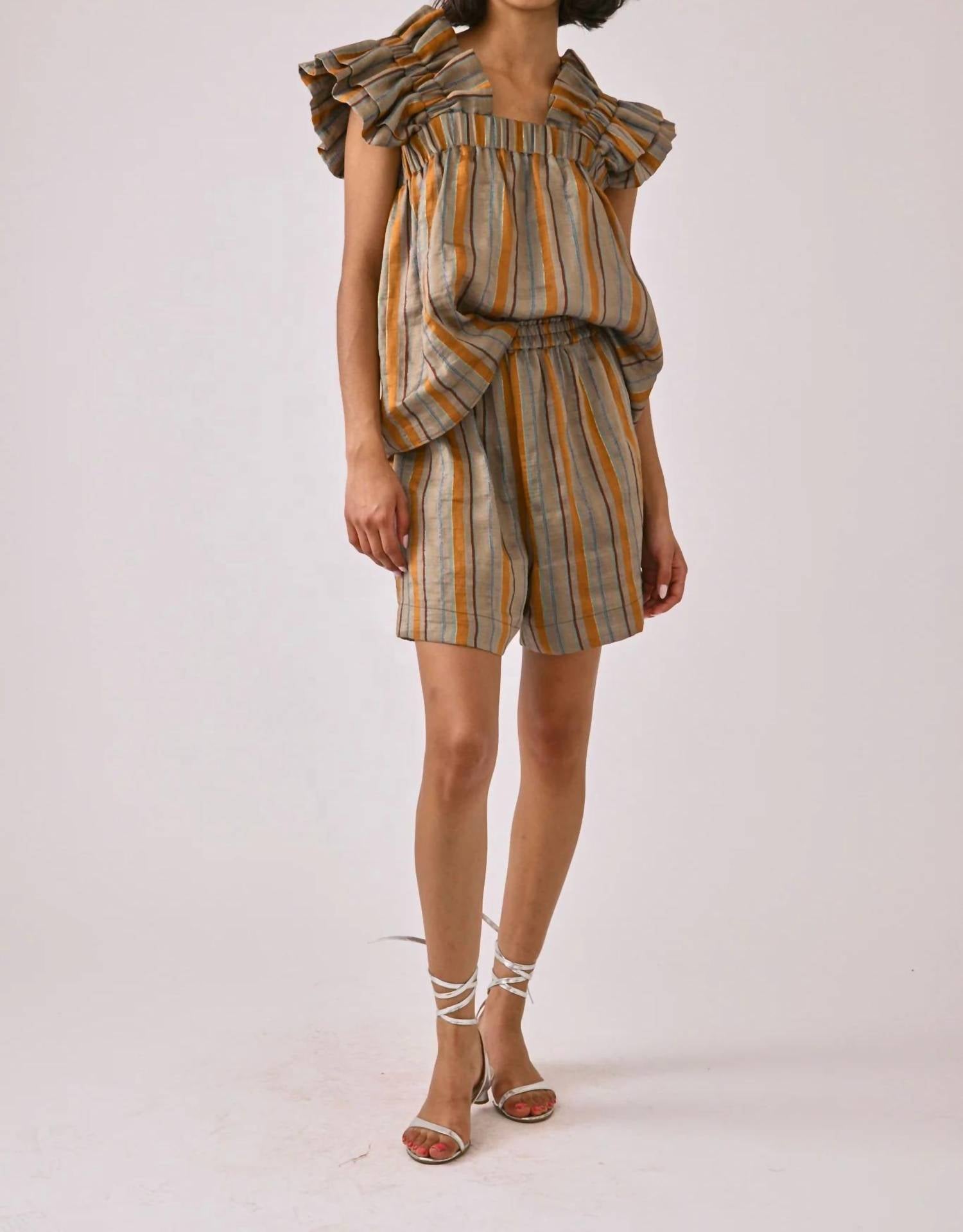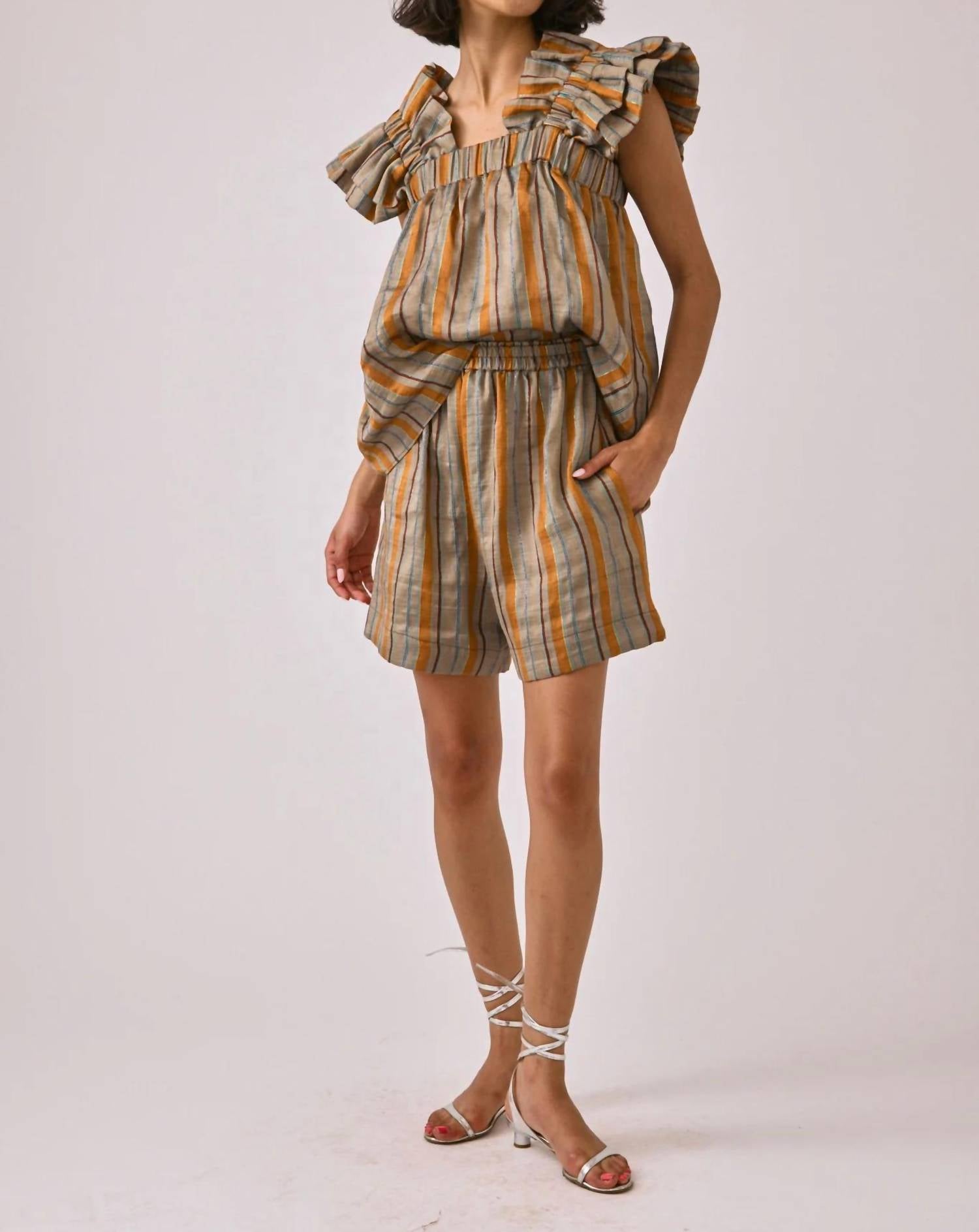 Introducing the Inclan Sterling Short in Moroccan Stripe, a stylish nod to 90s fashion perfect for warm spring days. These high-waist shorts feature a loose fit for maximum comfort, crafted from an 87% Linen, 12% PA, 1% PL blend, ensuring lightweight and breathable wear. They include a practical pull-on closure with an elastic band, adding extra ease and comfort to your beach day ensemble. Complete with pockets, these shorts effortlessly blend function with style.