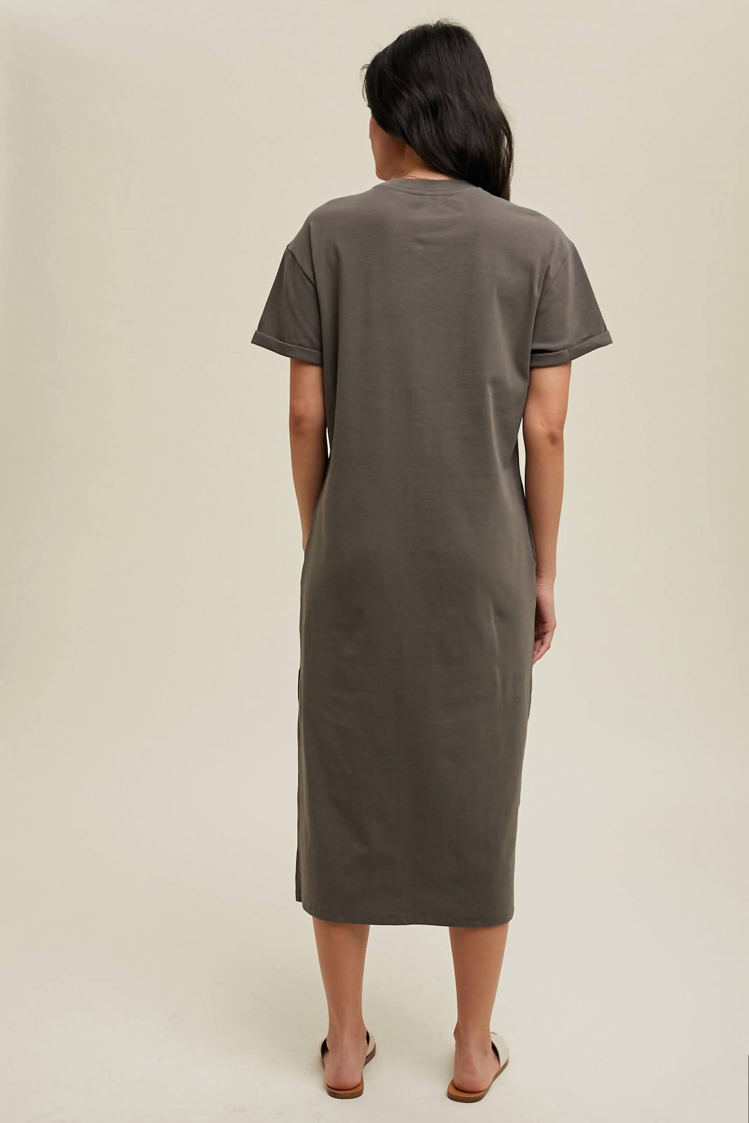Meet the Shelby Midi T-shirt Dress by PINCH, an effortlessly stylish piece in a Dark Lizard Grey hue, perfect for fall. Featuring short rolled sleeves and a comfortable shift silhouette, this dress is crafted from a 95% cotton, 5% spandex blend for ultimate comfort. A chic midi dress with practical pockets, it's designed to be worn alone or stylishly belted. Pull on. Hand wash.