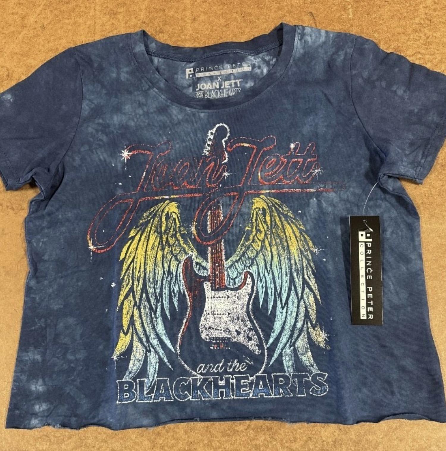 Look no further, you just found your perfect tee! Embrace your rock and roll spirit with the Women's Joan Jet And The Blackhearts Cropped Tee by PRINCE PETER. This short sleeve tee is crafted from 100% cotton and proudly made in the USA. It features a tie-dye blue graphic print with a crewneck design, perfect for a rebellious edge. Closure: Pull on.