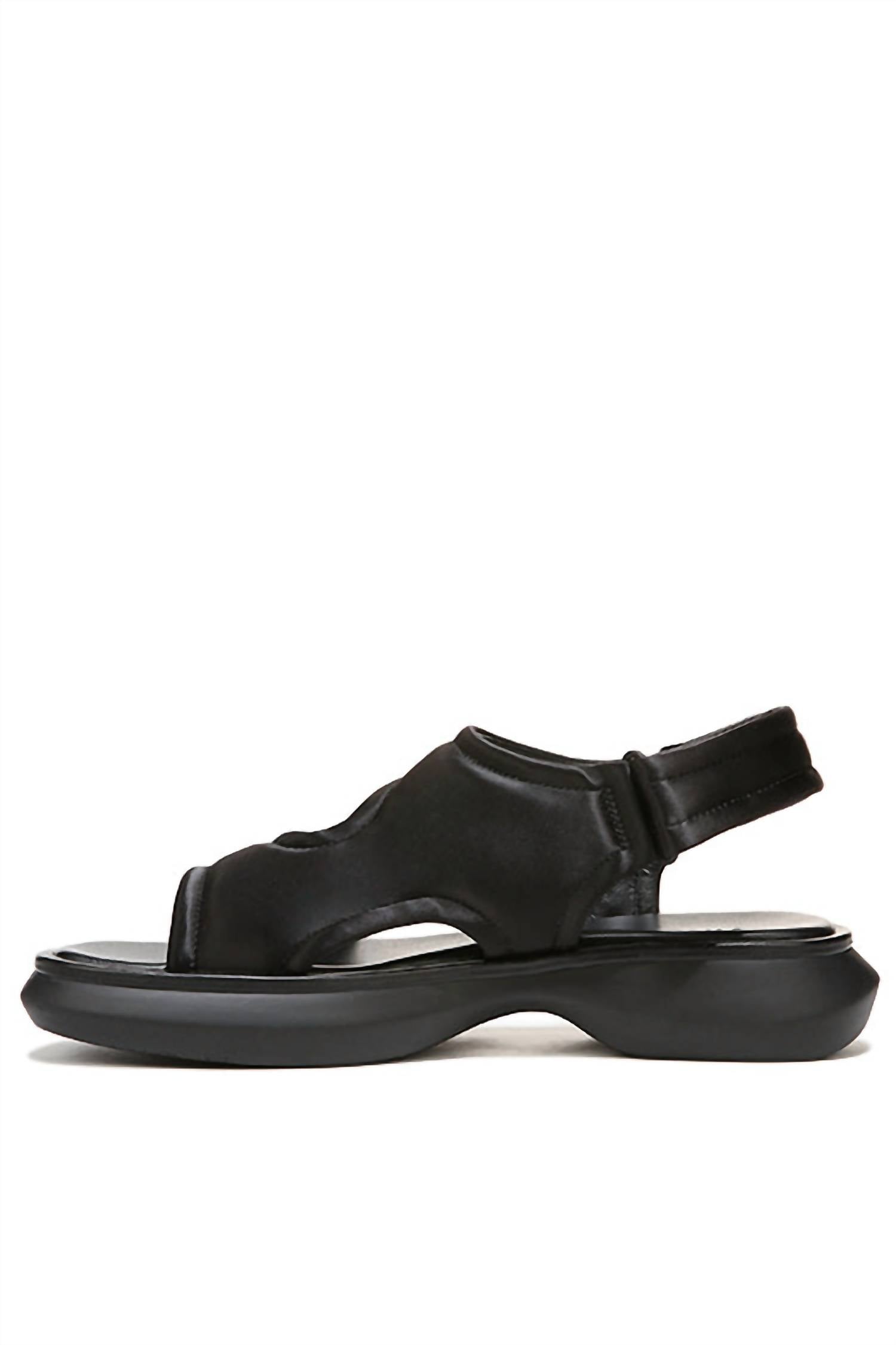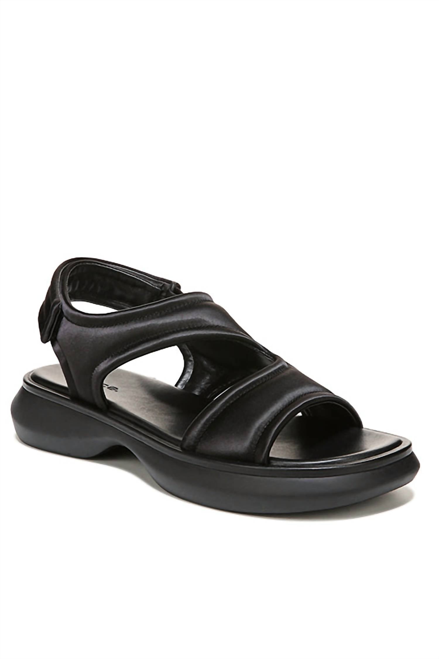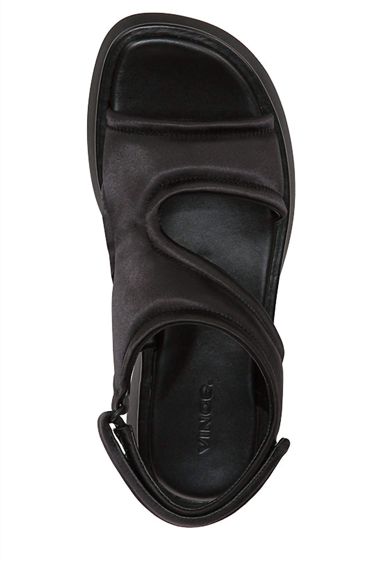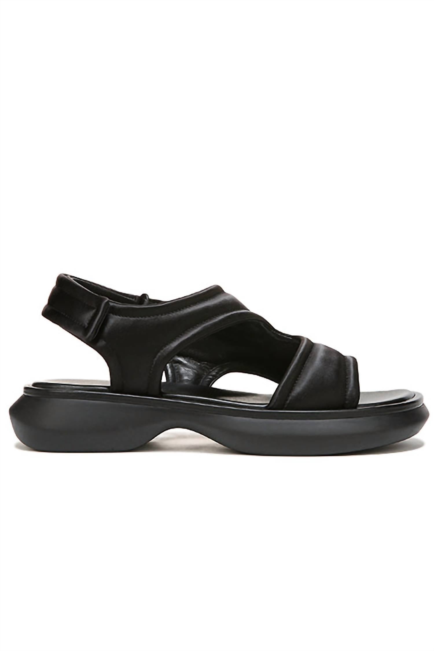 Step into summer with ease and elegance in the Women's Fresca Satin Sandal by Vince, a chic black sandal crafted for both comfort and style. Featuring a supple suede construction, this sandal incorporates a sculptural platform sole and boasts an adjustable Velcro closure for a customizable fit. This women's 100% leather slingback design highlights an open square toe and a flat heel measuring 1.5 inches for a subtle lift. Please note that the sandals are imported and require professional cleaning to maintain their luxe appeal.