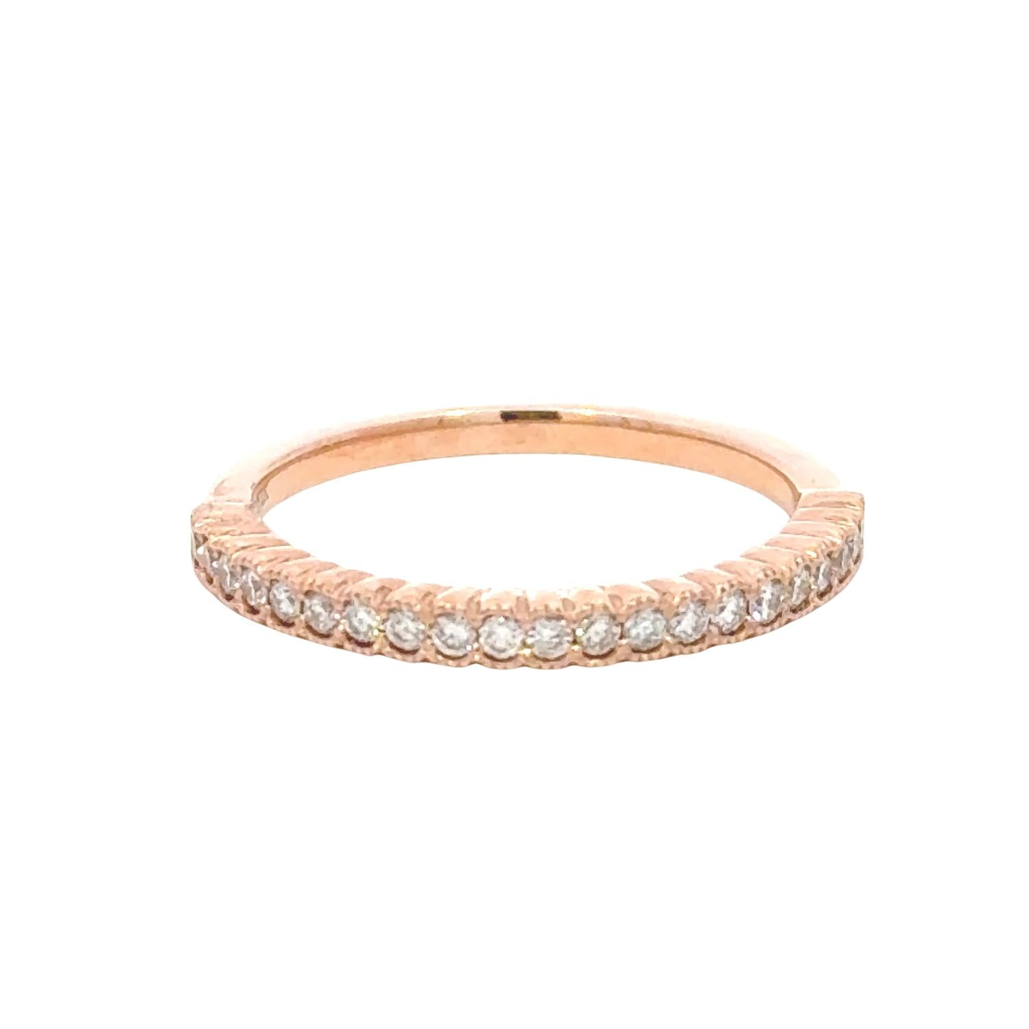 The wear-everywhere ring that you won't want to take off. This refined half eternity band ring size 6.5 features 0.25 carats of natural round brilliant diamonds prong set across a smooth 14K rose gold band. The edges are subtly textured, giving the piece a distinctive finish with extra detail. Graded G-H color and VS-SI clarity, the diamonds offer clean, radiant sparkle. Weighing 2.30 grams, this band is slim, elegant, and perfect for stacking, gifting, or daily wear. Metal: 14K Rose Gold. Diamond Weight: 0.25 Carat Total (Natural Diamonds). Diamond Shape: Round Brilliant. Style: Half Eternity Band / Stackable. Design Detail: Textured Edge. Band Width: Approx. 1.6–2.0mm. Total Weight: 2.30 grams