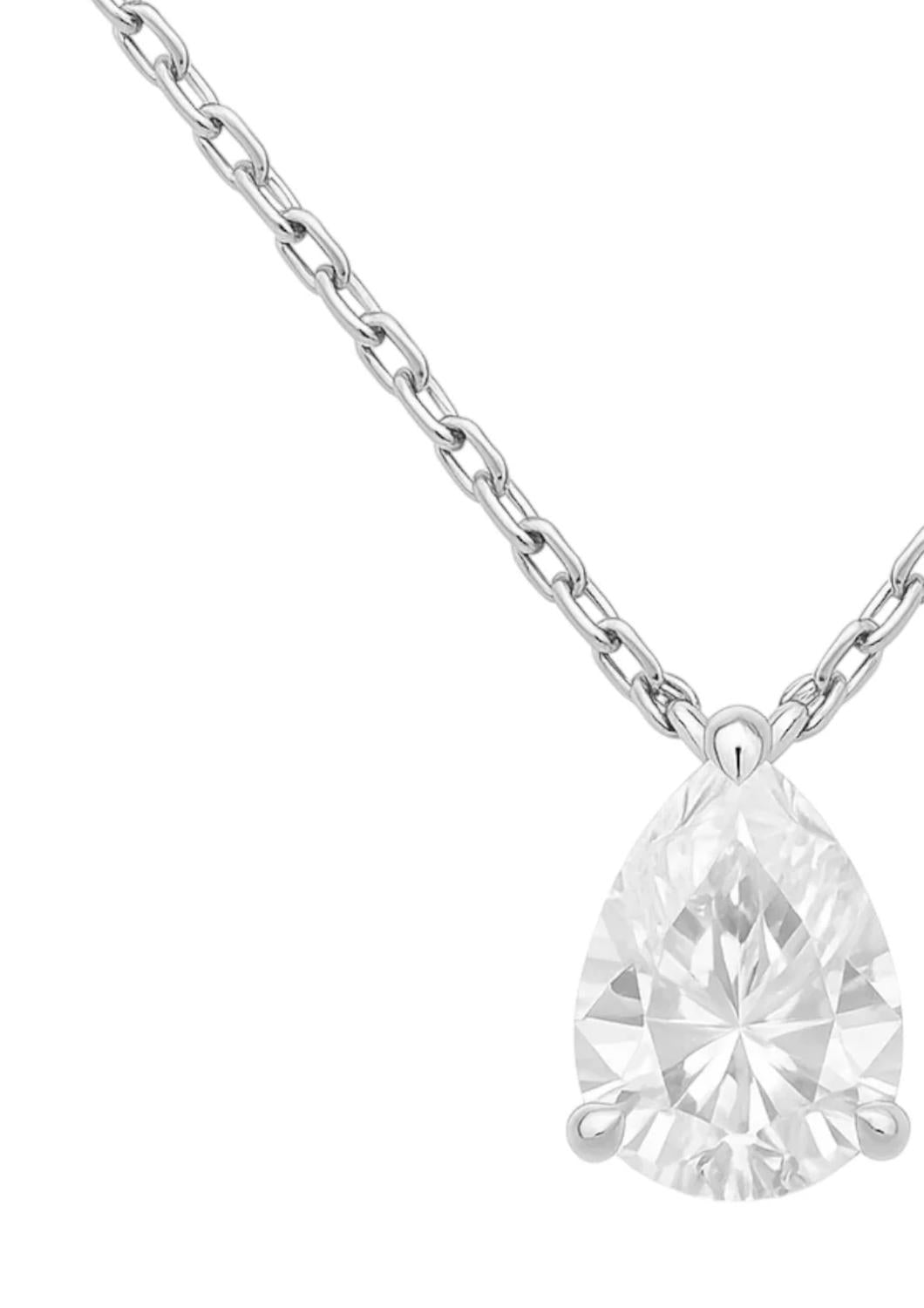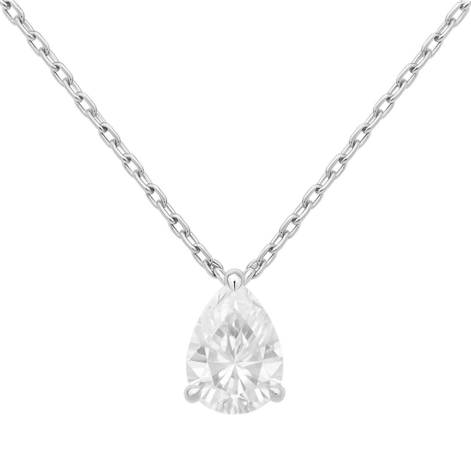 Discover timeless elegance with the Women's Moissanite Pear Shape Solitaire Necklace by Allyanna Gifts. This fine piece showcases a stunning 3.0ct pear-shaped moissanite stone, meticulously crafted to a 10mm x 8mm dimension, set in exquisite sterling silver. It's an embodiment of elegance and sophistication, perfect for any occasion. Embrace luxury and grace with this remarkable necklace.
