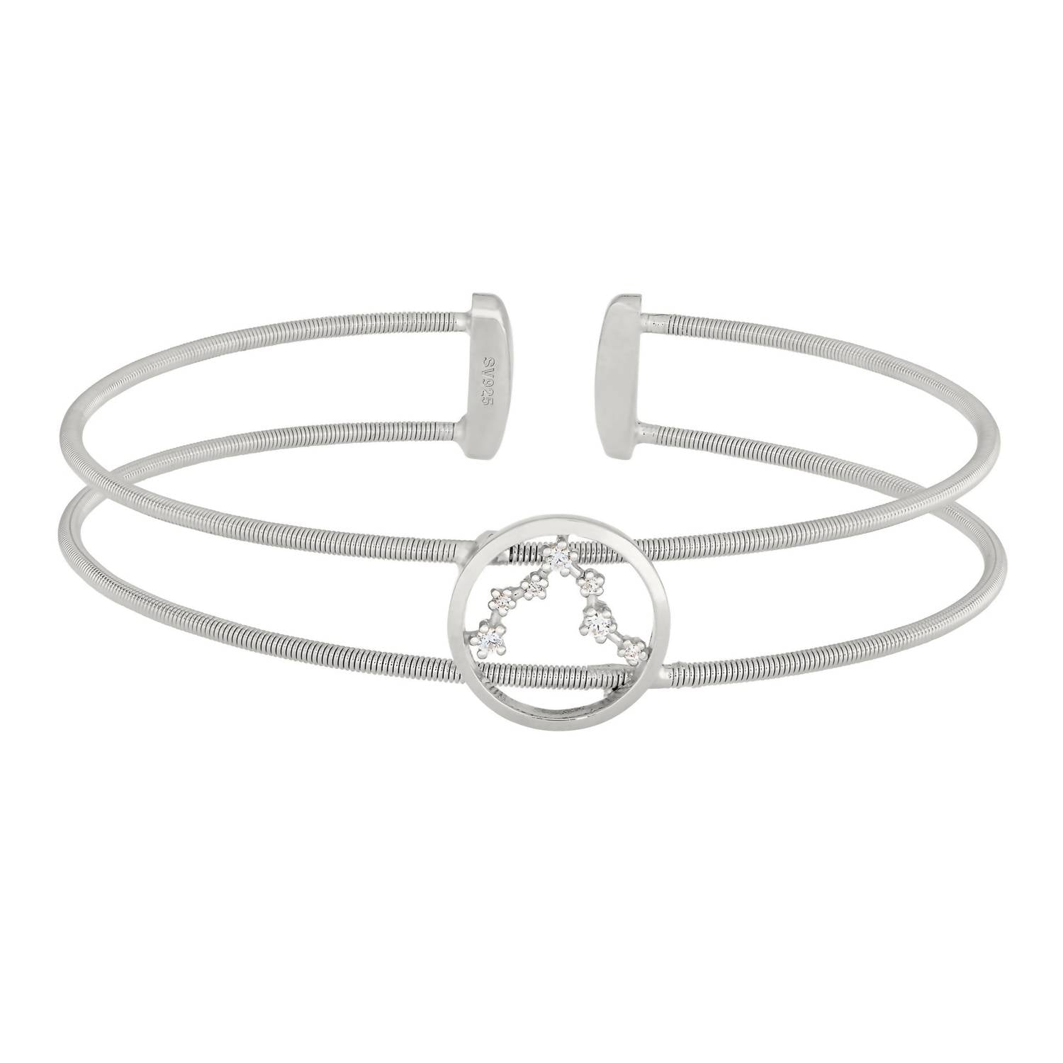 This bracelet will be your favorite go-to piece of the season. Adorn your wrist with the Rhodium Pisces Cable Cuff by Bella Cavo, a stunning bracelet featuring a constellation design with simulated diamonds. This exquisite piece is crafted from sterling silver with a rhodium finish, ensuring both elegance and durability. The silver tone perfectly complements any outfit, making it a versatile addition to your accessory collection. Whether dressed up or down, this bracelet is sure to enhance your personal style.
