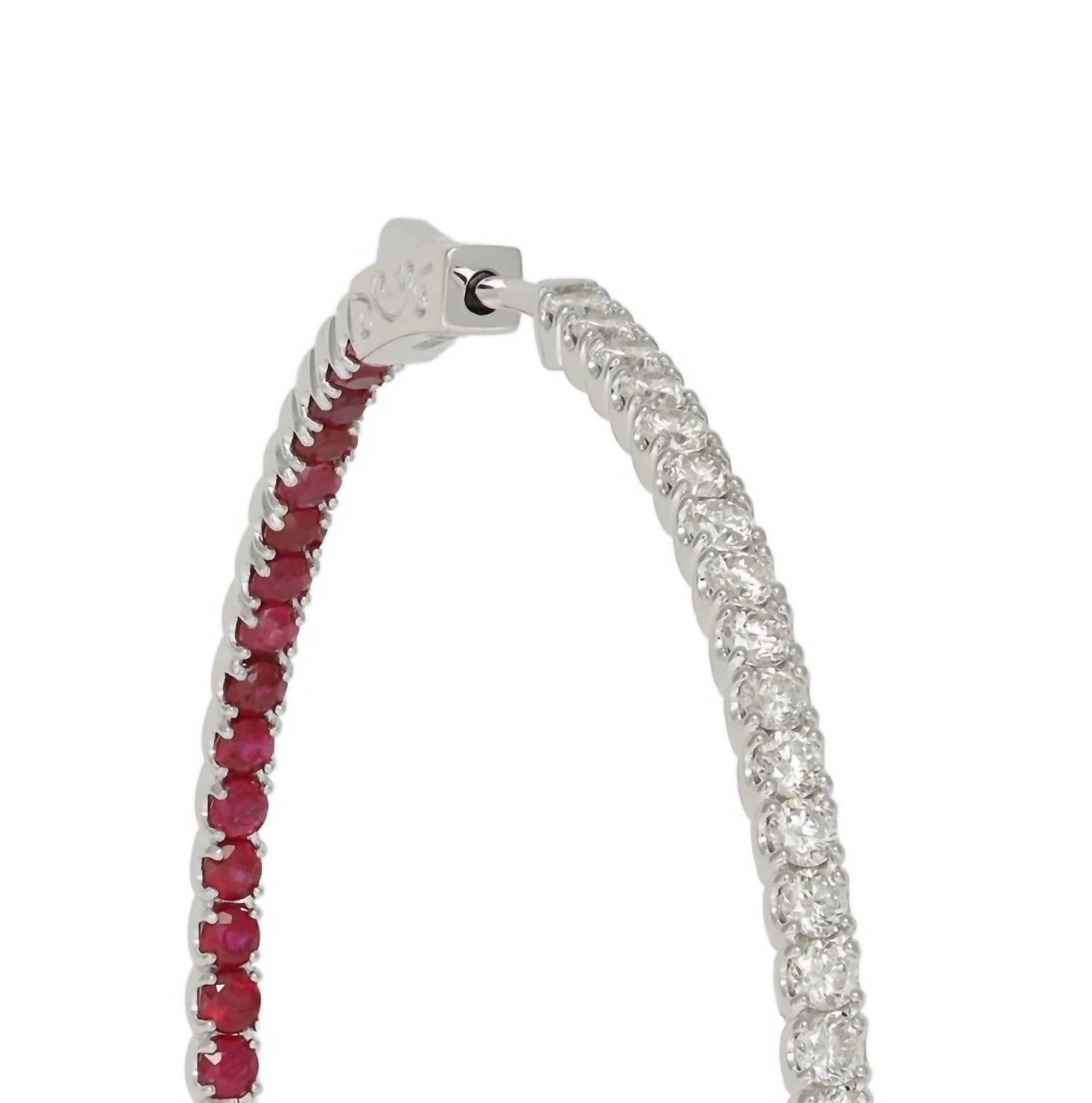 This bracelet will be your favorite go-to piece of the season. Introducing the 2" Hoop Earrings by Diana M Jewels, a stunning accessory crafted in 14k white gold. These fine jewelry pieces feature 2.40 carats of round brilliant, prong-set natural diamonds and 2.56 carats of stunning rubies. Using a hinged clasp, these earrings secure elegantly, enhancing any outfit with their exquisite sparkle. Ideal for those with a penchant for luxurious, natural gemstones, these earrings are a timeless addition to any jewelry collection.