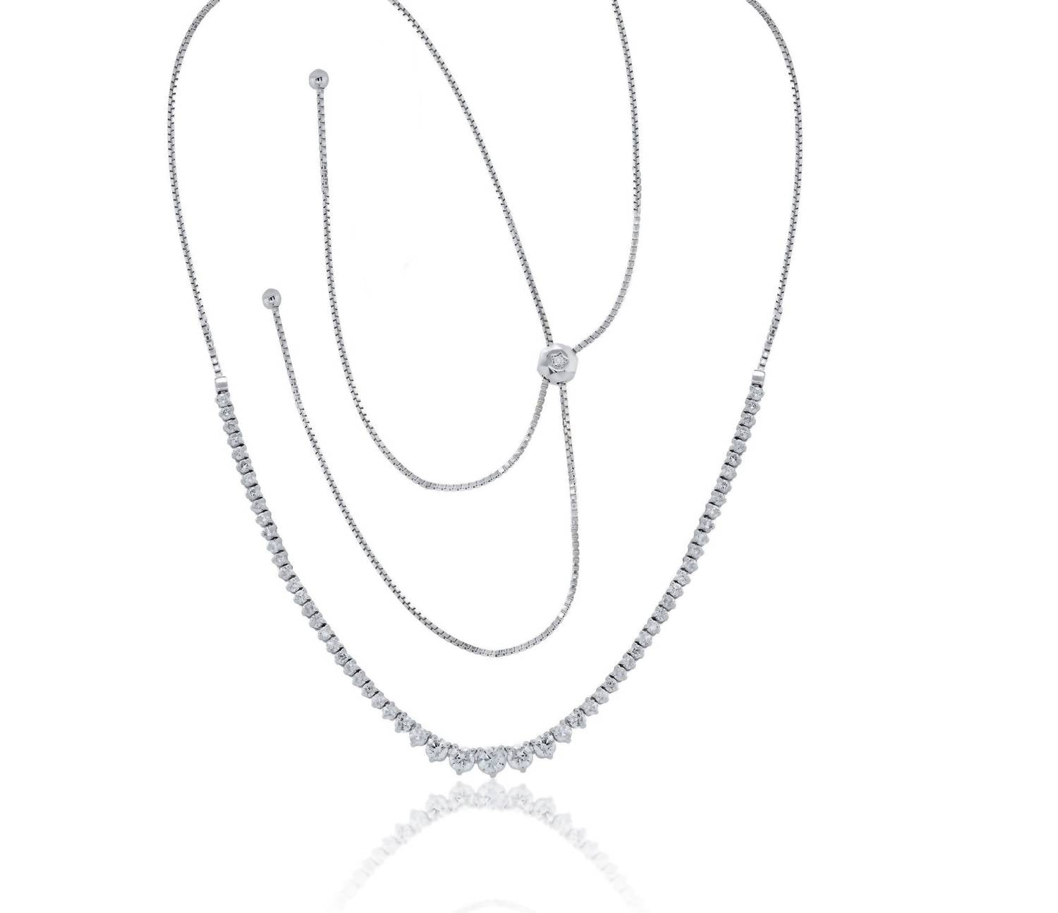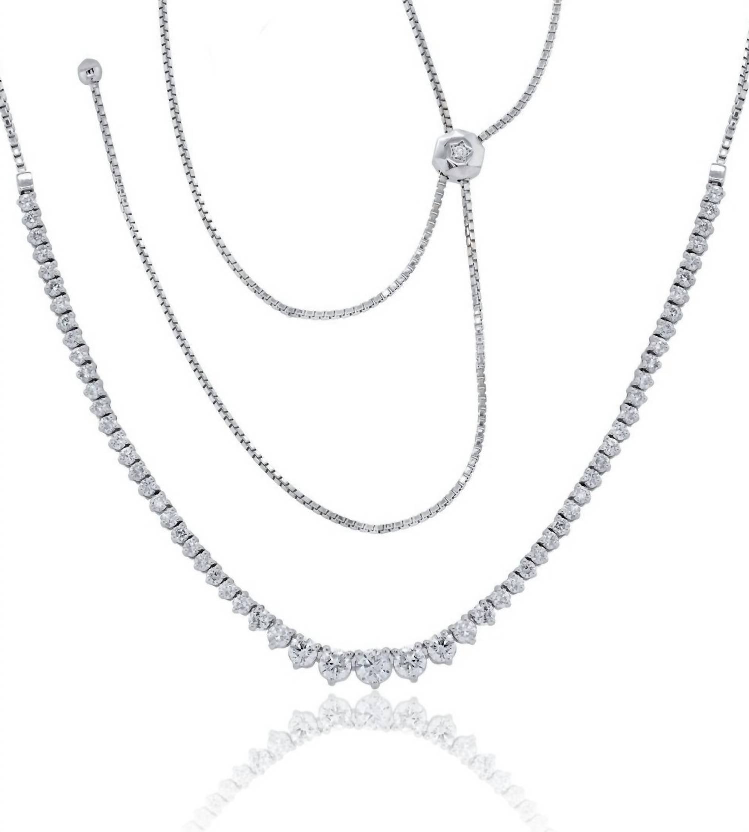 Indulge in the exquisite elegance of the 4.40 Cts Diamond Bolo Graduated Half-way Necklace by Diana M Jewels, a fine addition to any collection. Crafted in 14 kt white gold, this 17" necklace showcases 4.40 cts of natural round brilliant diamonds arranged in a captivating prong setting. The bolo clasp ensures a secure fit, while the timeless white diamonds make it a perfect April birthstone gift. Ideal for those who appreciate superior craftsmanship and luxurious design.
