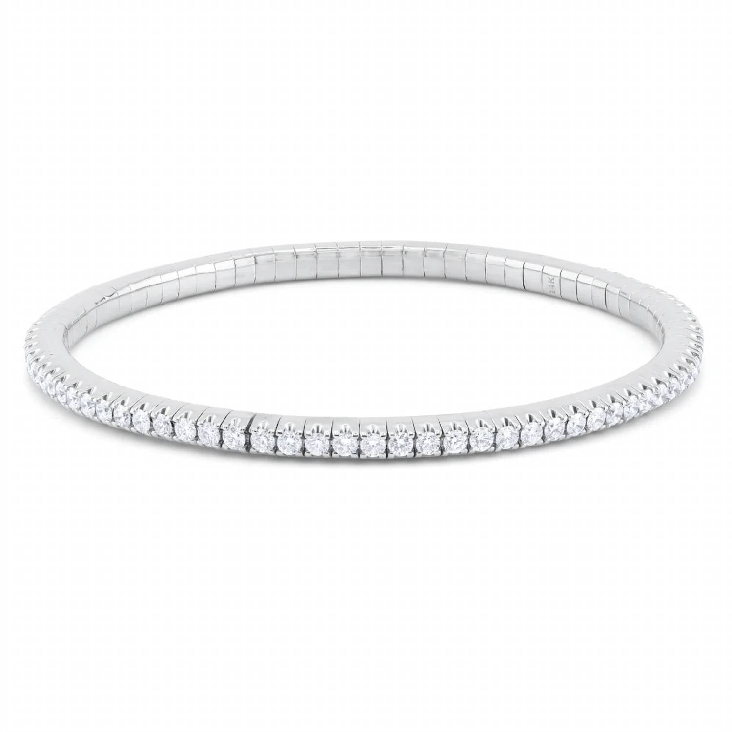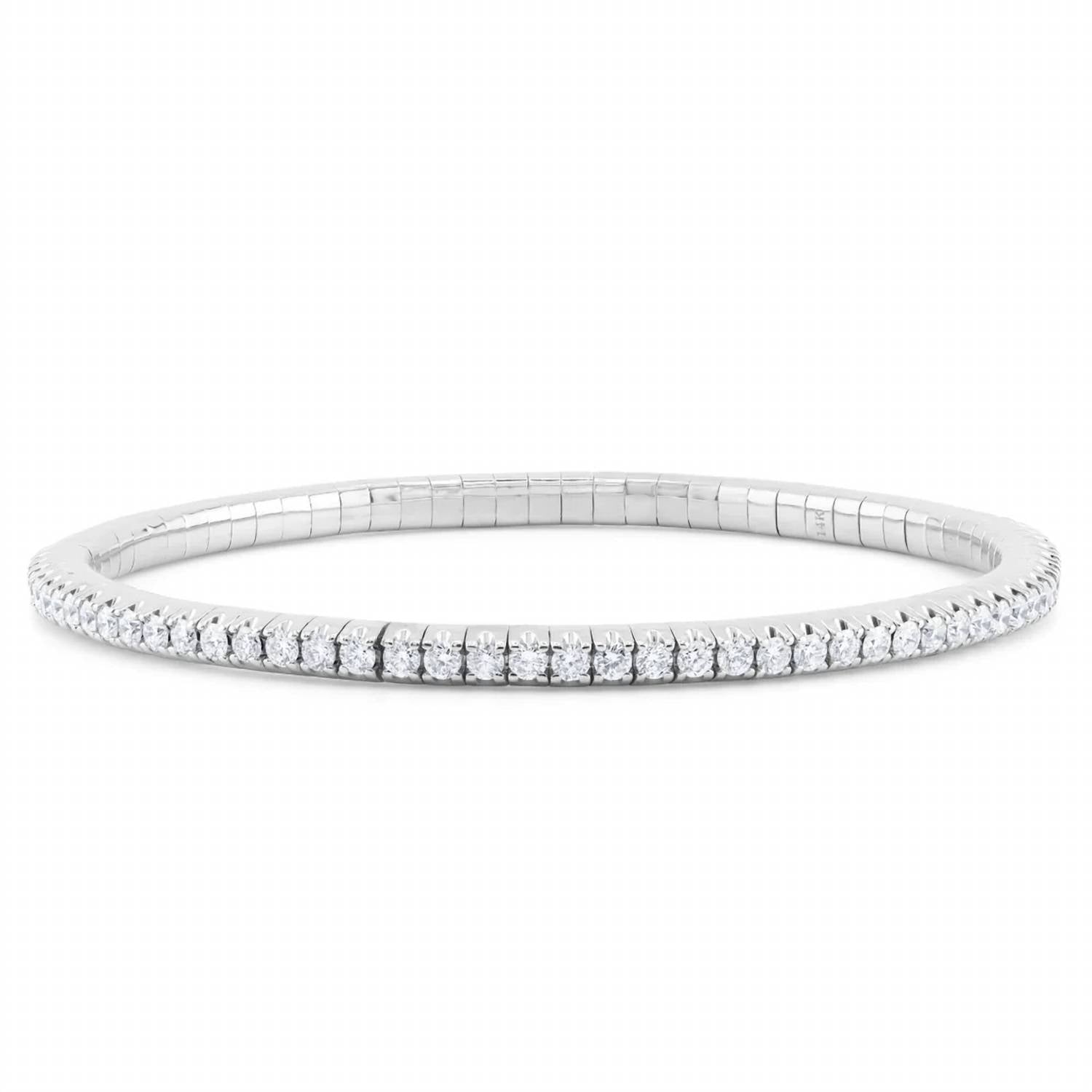 Stacked or solo - you can't go wrong with this bracelet. Introducing the Flexible Diamond Tennis Bracelet by Diana M Jewels, an exquisite piece crafted from 14k white gold. This fine bracelet effortlessly slips on and sparkles with 3.25 carats of natural white round brilliant diamonds, elegantly set in a prong setting. It captures the timeless elegance of April's birthstone. Perfect for adding a touch of luxury to any ensemble.
