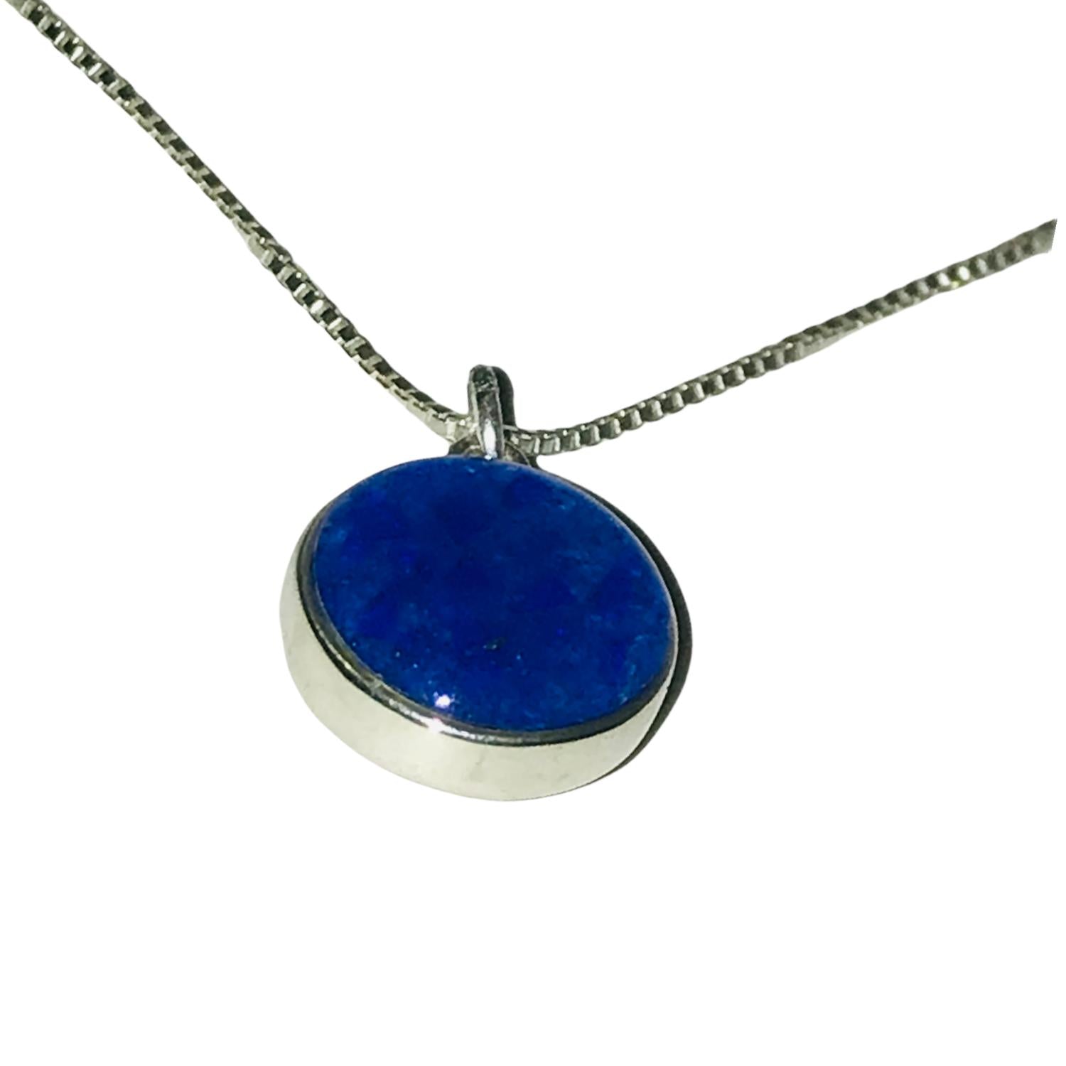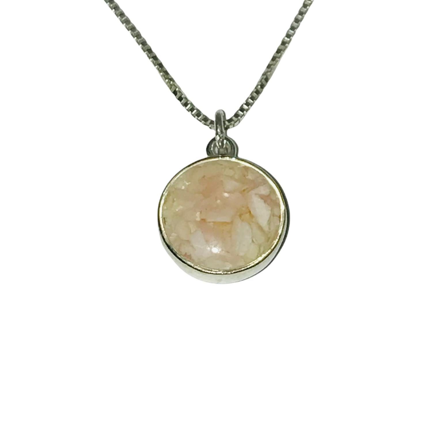 Introducing the Sandglobe Necklace - Two Element by Dune Jewelry, a stunning piece crafted for those who appreciate unique detail. This sterling silver necklace features a beautifully round, double-sided setting highlighting natural Blue Sea Glass and Conch Shell elements, each with a gem-like finish. Measuring 10mm in diameter, it sits slightly smaller than a dime, and is paired with a 14k gold-filled box chain available in 16, 18, or 20 inches. Handmade with care in the USA, it's a statement of elegance and nature combined.