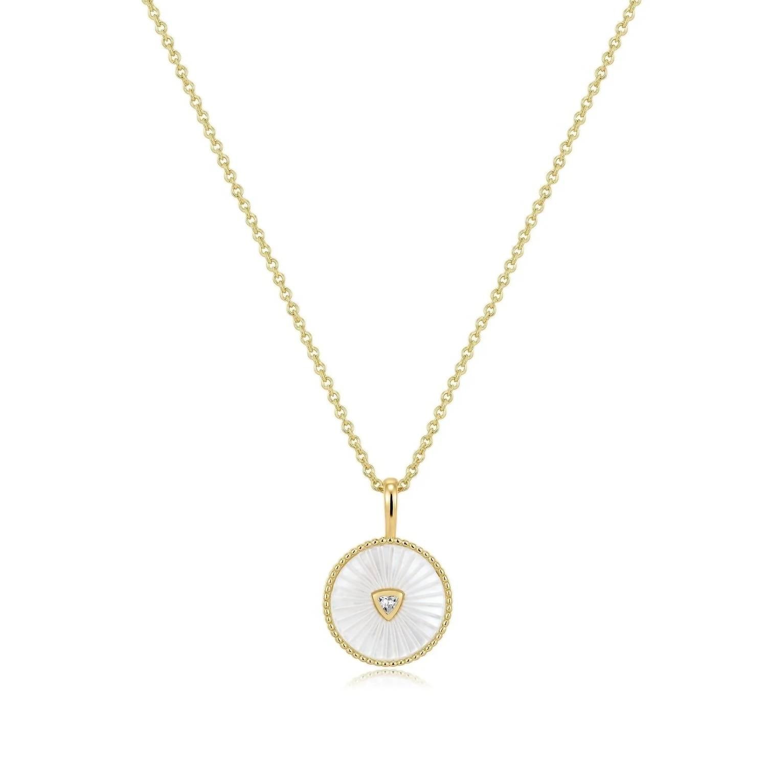 The perfect stand-out necklace that complements even the most basic t-shirt. Presenting the Women's Mother of Pearl Pendant Necklace by Eklexic, a masterpiece of fine jewelry. It features a splendid 14K gold vermeil finish, crafted from recycled 925 sterling silver. The necklace has a length of 16 to 18 inches, accommodating a stunning pendant with a round brilliant cubic zirconia center stone and a distinctive MOP accent. The eco-friendly design embodies both sustainability and elegance, making it a cherished addition to any jewelry collection.