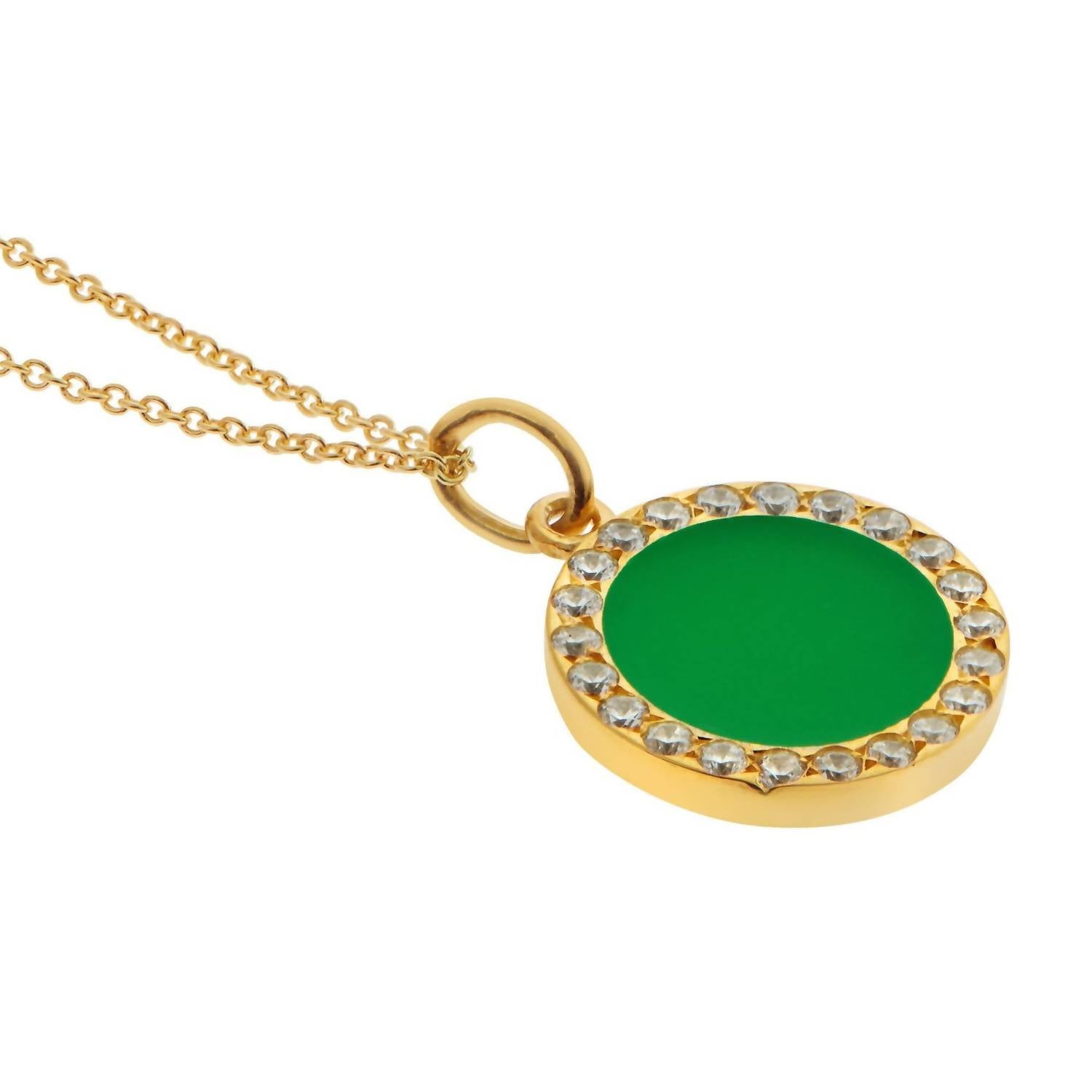 The perfect stand-out necklace that complements even the most basic t-shirt.Smooth enamel pendant. Handcrafted from sterling silver 18k gold plated. Featuring a bright splash of neon green enamel adorned with a halo of sparkling crystals. Clear zircons. Enamel finish. Charm diameter approx. 1.5cm. 17" 18k gold plated chain.