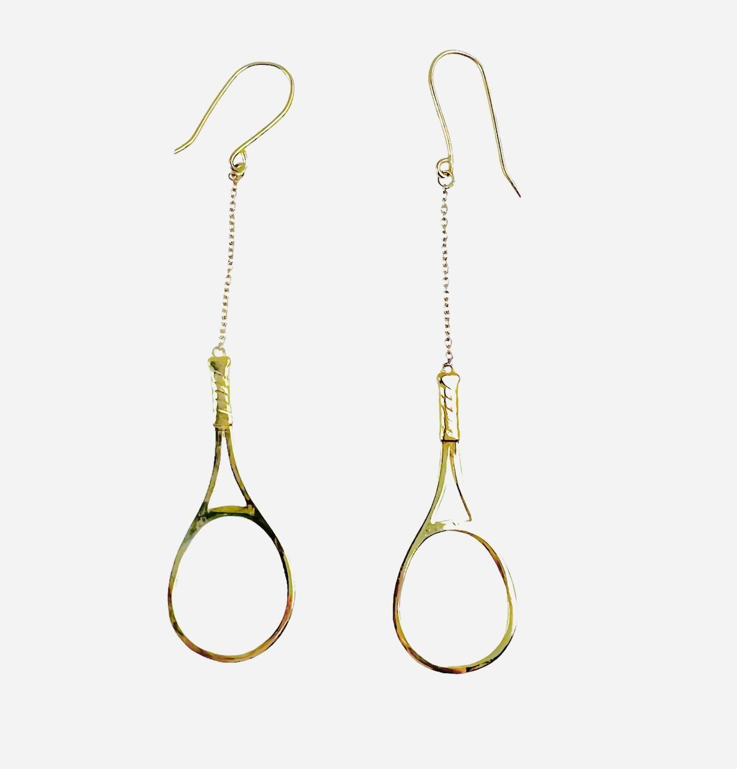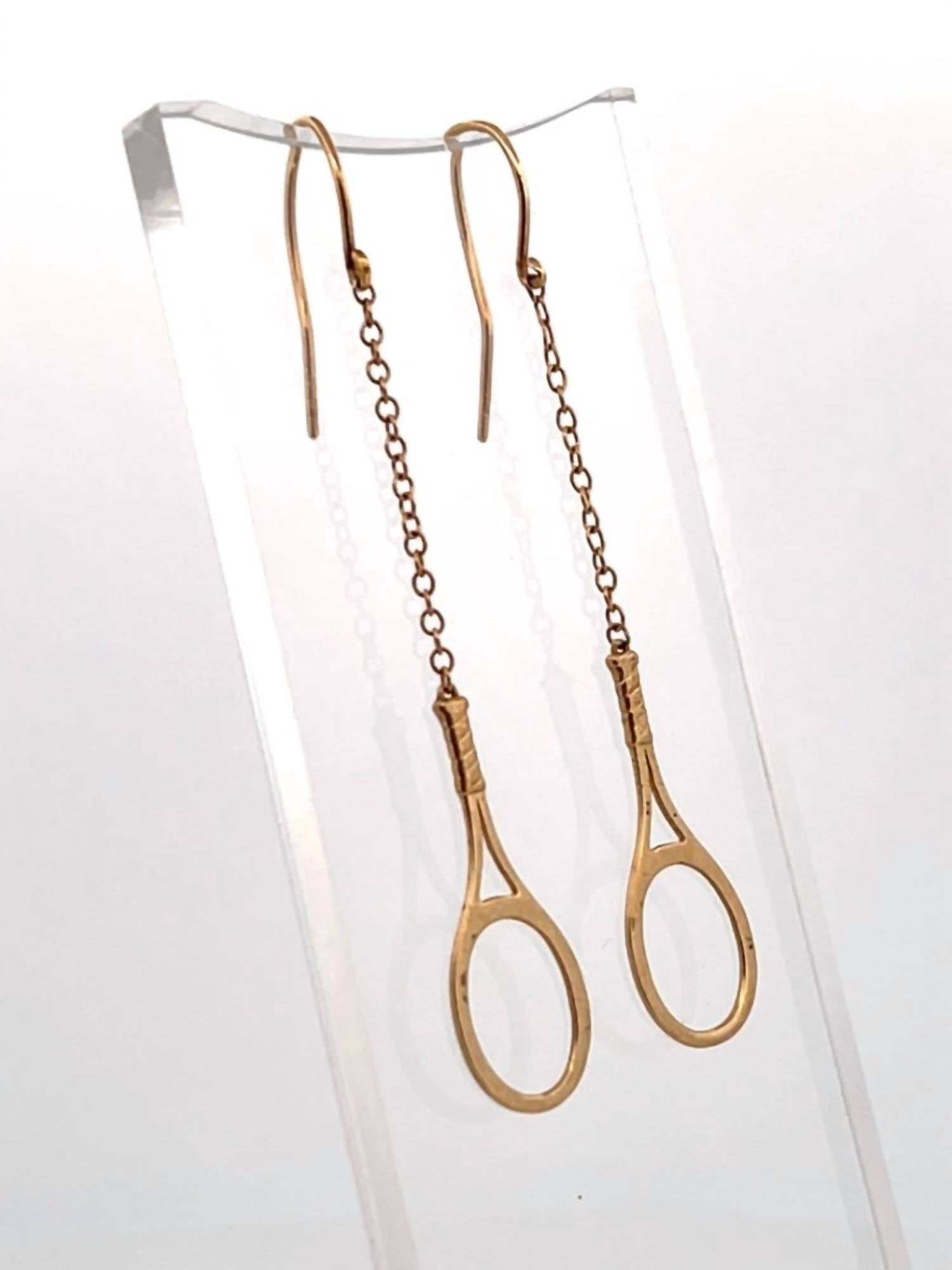 Classic earrings that will take you from season to season. Embrace the elegance of Love Love Tennis with the Women's Tennis Racket Solid Gold Earrings, meticulously crafted in 14k Yellow Gold for enduring beauty. These feminine earrings feature a 1" tennis racket design and a total length of 2 1/2", perfect for adding a sporty touch to any outfit. Their hook closure ensures a secure and comfortable fit. Enjoy the timeless allure of these earrings, ideal for both on and off the court.