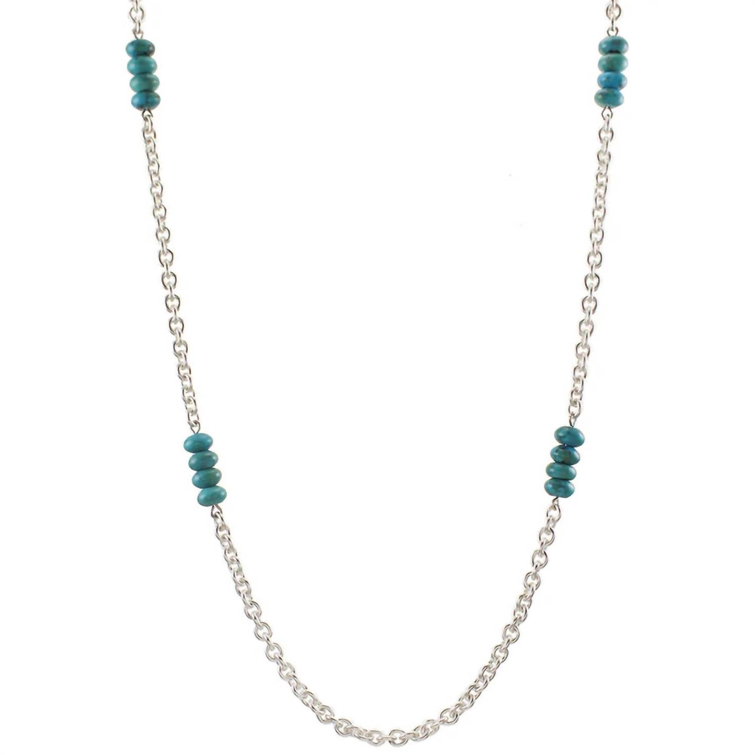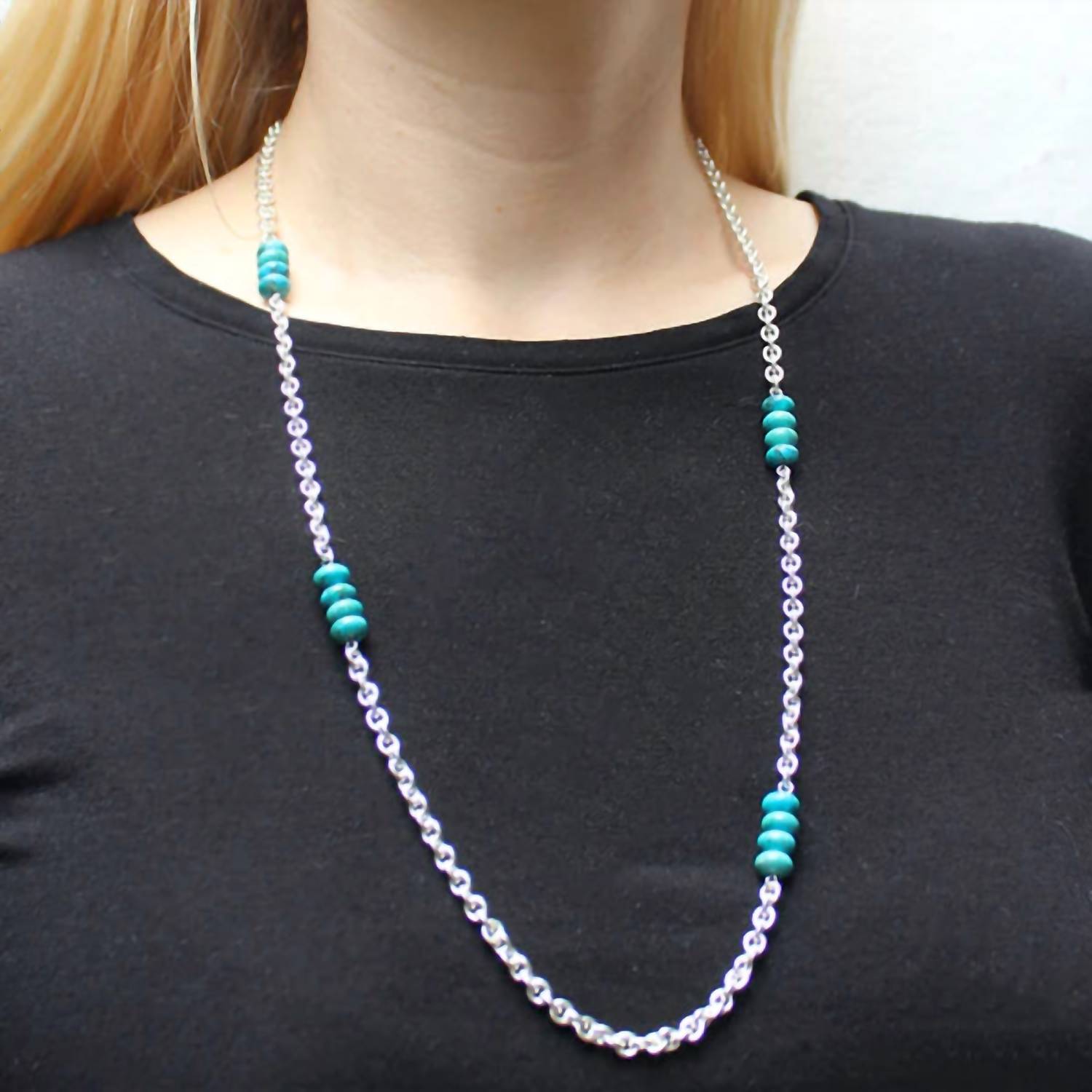 Layer this necklace or wear it on its own. Either way it's a win-win. Introducing the Chain With Stacked Turquoise Beads Necklace by Marjorie Baer, a stunning fashion accessory that adds a pop of color to any outfit. This long, 28-inch necklace is crafted from stainless steel in a sleek silver with vibrant turquoise bead stacks, each measuring 0.3 inches in width and 0.75 inches in height. Designed with practicality in mind, it features a lobster claw closure and includes a 3-inch extender chain for adjustable wear. Proudly made in the USA, this necklace is a perfect blend of style and craftsmanship.