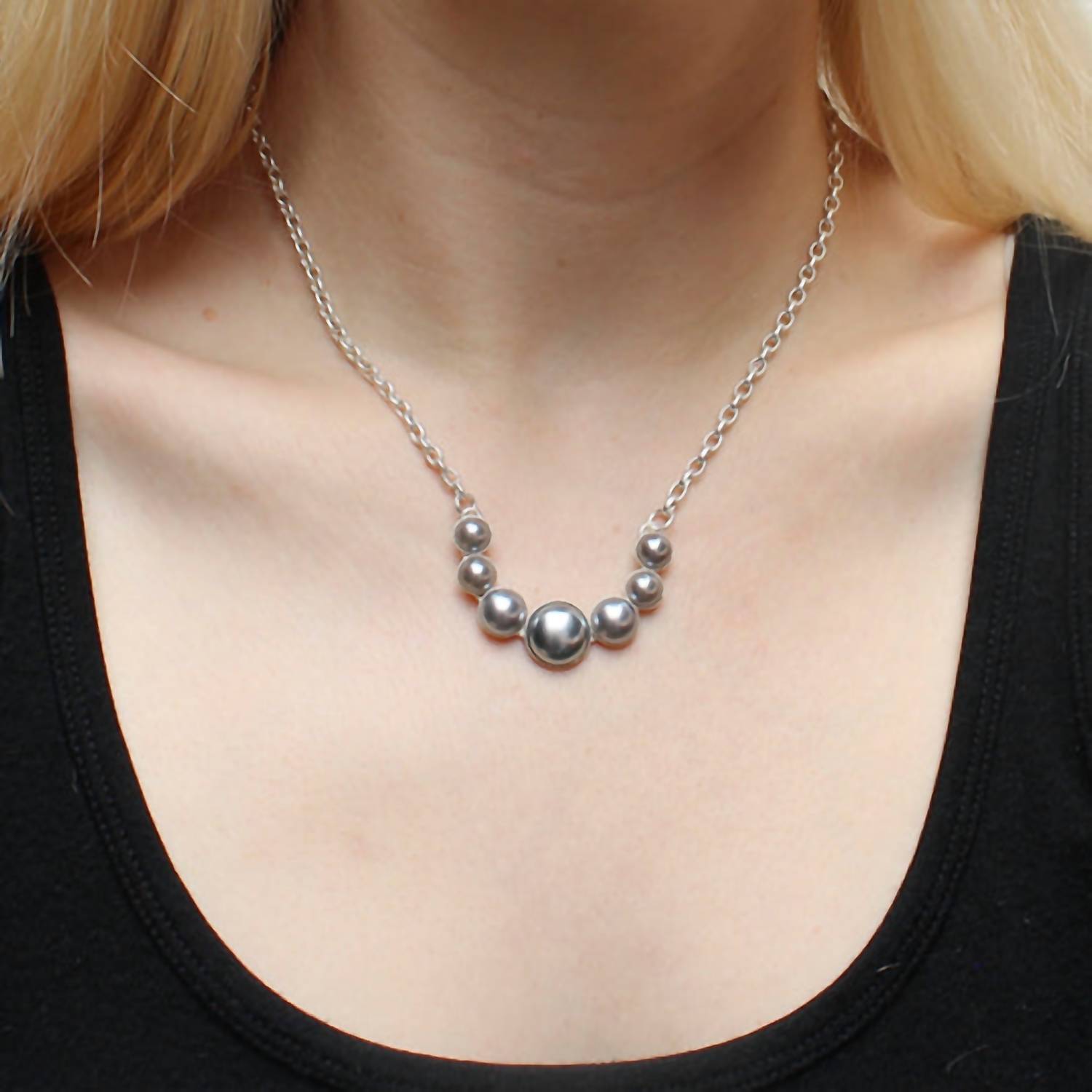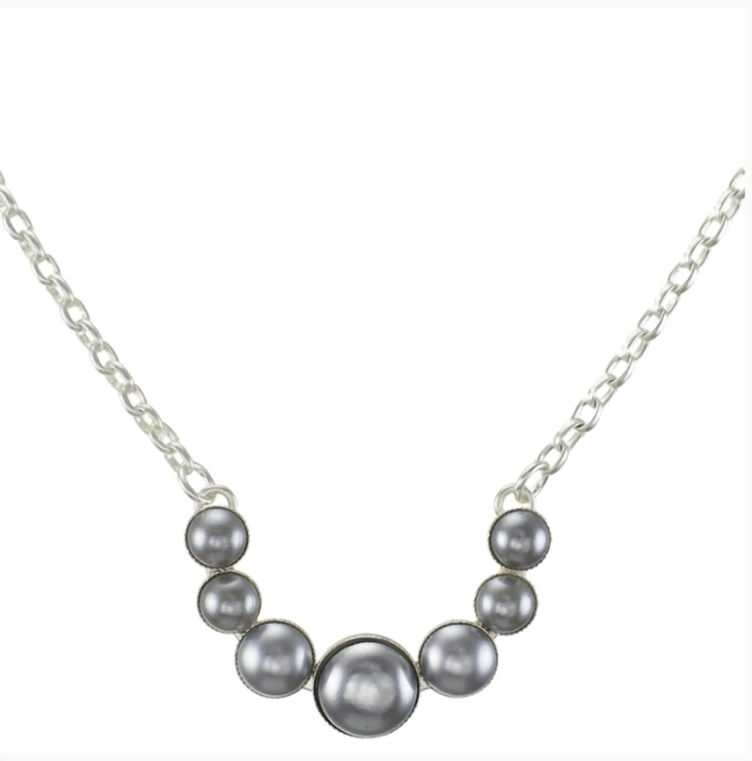 Both understated and impactful, you'll be reaching for this one-of-a-kind necklace season after season. Elevate your ensemble with the Women's Semi Circle Arc Grey Cabochons On Chain Necklace by Marjorie Baer, a sophisticated piece crafted for fashion-forward individuals. This necklace features a pendant composed of seven graduated grey pearl cabochons elegantly arranged on a semi-circle arc and suspended on a silver link chain. With a pendant size of 1.75 inches wide by 1.1 inches long and an overall necklace length of 16 inches, it offers a perfect accent to any outfit. Made with silver plating, this elegant accessory adds a subtle yet striking touch to your wardrobe.