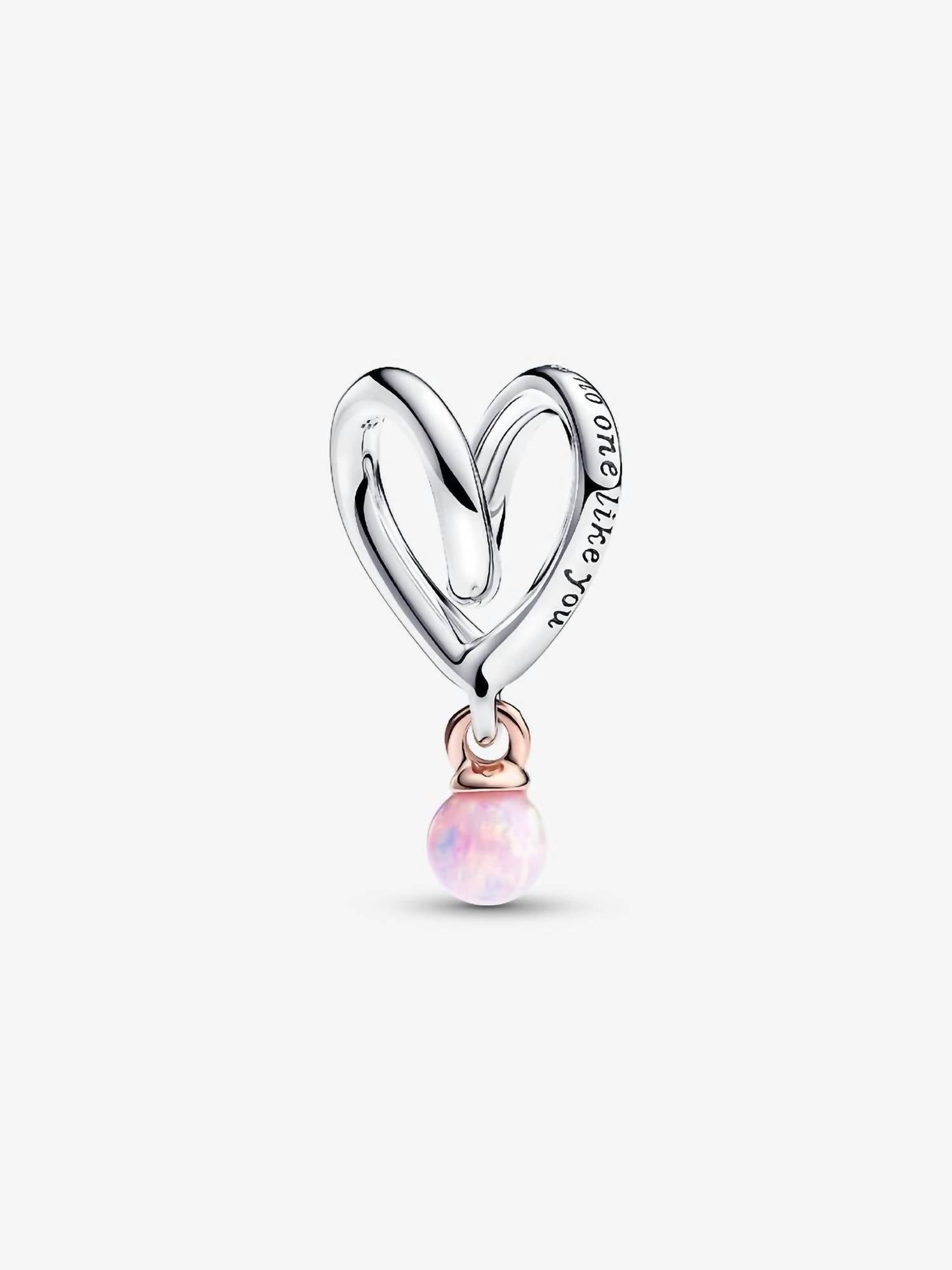Crafted in sterling silver and plated with 14k rose gold, the Two-tone Wrapped Heart Charm is a unique piece for your Mom's collection. Meticulously designed to wrap around any charm carrier, this charm features a captivating motif—a heart formed by looping sterling silver lines. Two engravings, "There is no one like you" and "Mom," add a loving touch, where the 'o' in mom is shaped as a heart. A dangling 14k rose gold-plated pin showcases a round pink lab-created opal, representing the beauty of motherhood. charm only