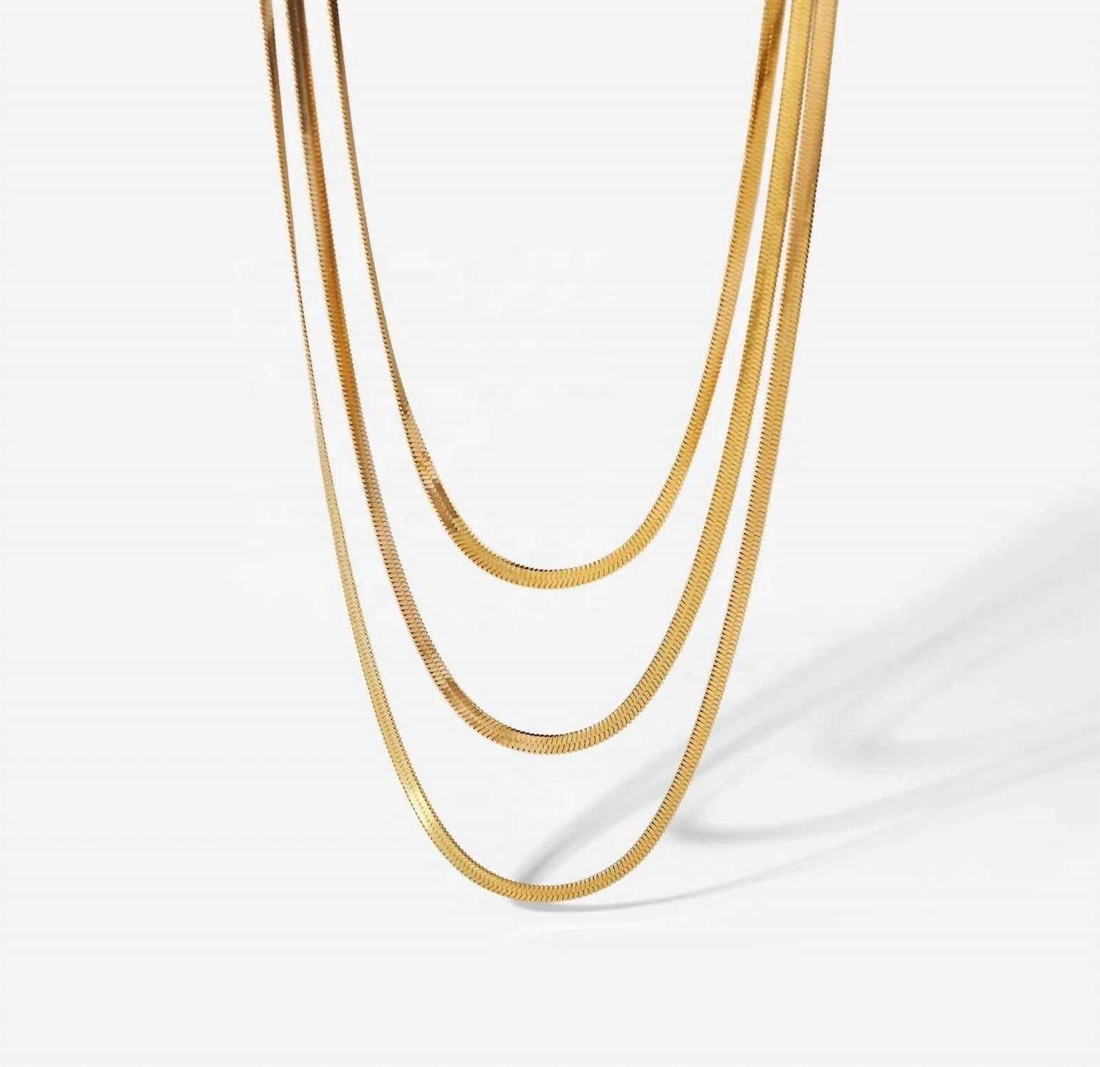 Layer this necklace or wear it on its own. Either way it's a win-win. Introducing the Women's Penelope Multi Layered Chain Necklace by SAHIRA, a stunning accessory featuring three layers measuring 16", 18", and 20" in length. Crafted from goldtone material and beautifully 18K gold plated, this necklace is both water and tarnish-resistant, ensuring long-lasting shine.