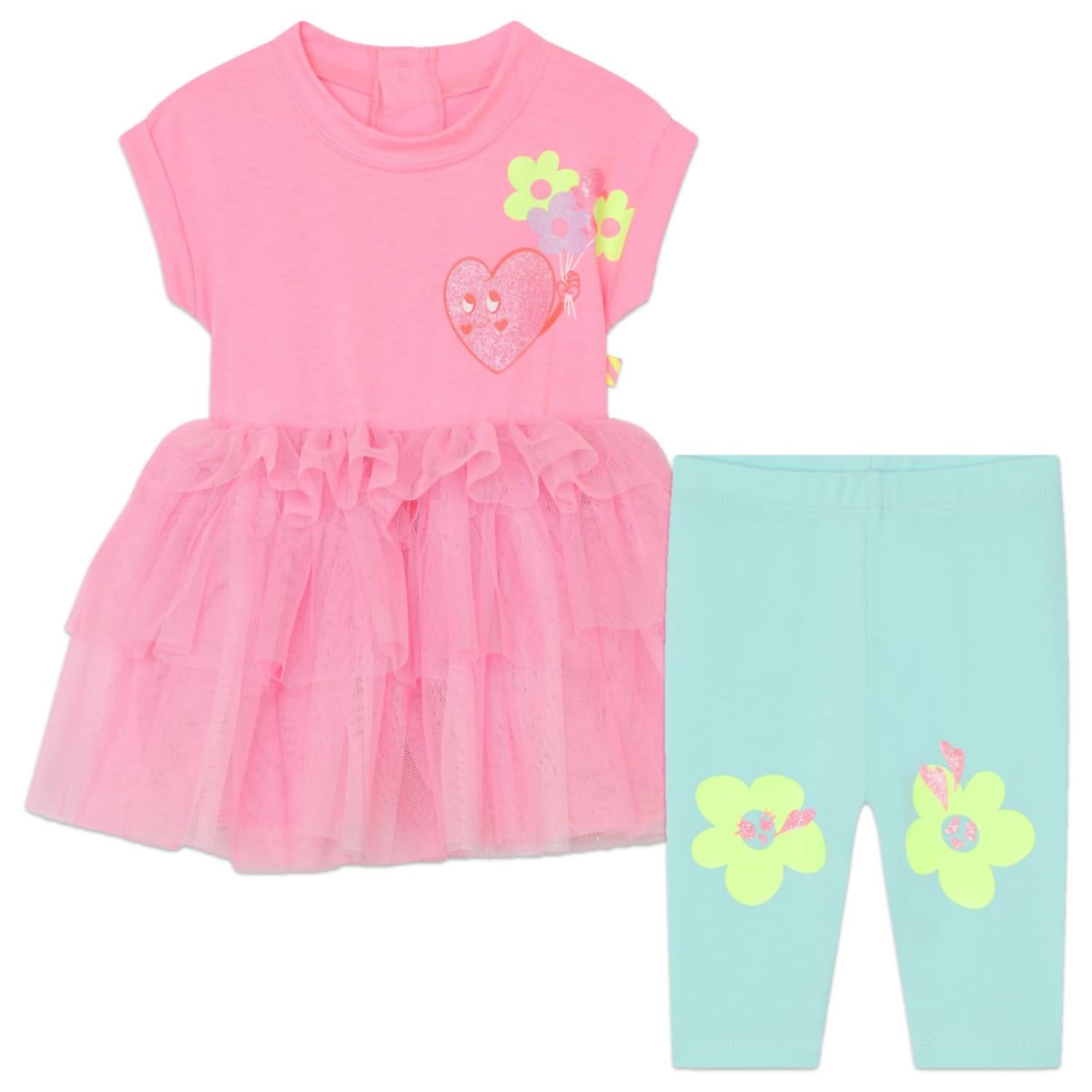 The Baby Jersey Tulle Dress & Legging Set by Billieblush, in a playful multi-color, is perfect for stylish little ones. The dress features a jersey bodice and a tulle skirt, composed of 65% polyester and 35% cotton, with a soft and lightweight 97% polyester, 3% cotton lining. It includes soft jersey leggings made of 59% polyester, 34% cotton, and 7% elastane. Closure: Popper fastenings. Care: Machine wash at 30°C.
