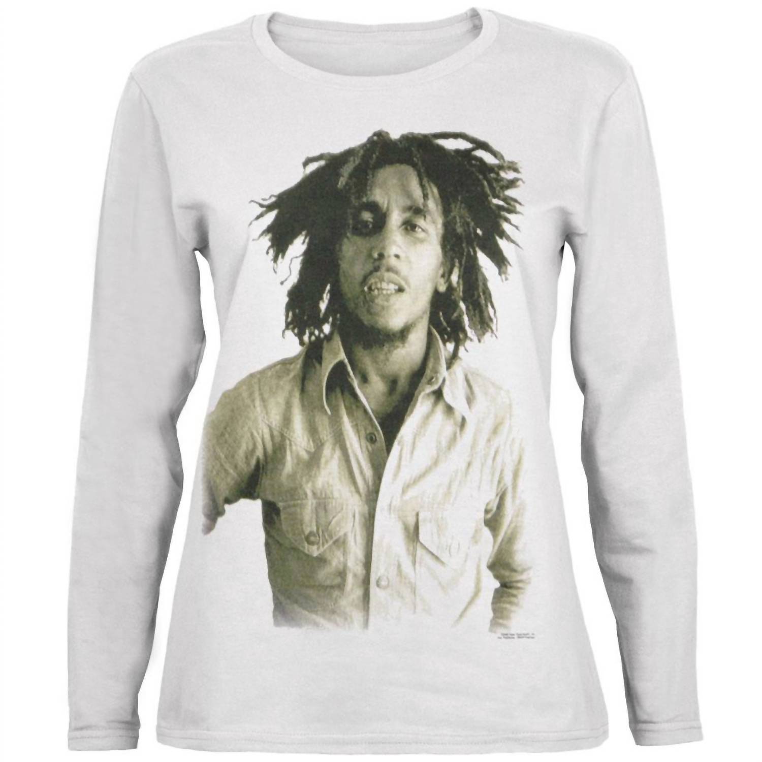Introducing the Teen's Sepia Juniors Long Sleeve T-shirt by Bob Marley, designed for music festival enthusiasts and streetwear lovers. This white crewneck tee features long sleeves and a striking graphic print. 100% Cotton for ultimate comfort. Care instructions include machine washing and tumble drying for easy maintenance. Perfect for spring occasions and festive gatherings.
