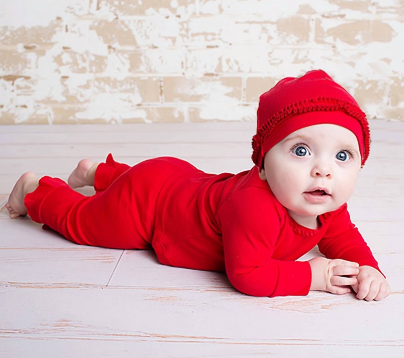 The Lemon Loves Layette "Anna" 3 Piece Set in true red is an exquisite choice for holiday comfort and style. Designed with long sleeves and signature ruffle detailing, this outfit showcases 100% Peruvian cotton craftsmanship. The set includes a top with an expandable collar, easy pull-up pants featuring a flare at the ankle, and a precious cap to complete the look. Made in Peru, it's a charming holiday gift and a perfect "Take Me Home" ensemble for newborns.