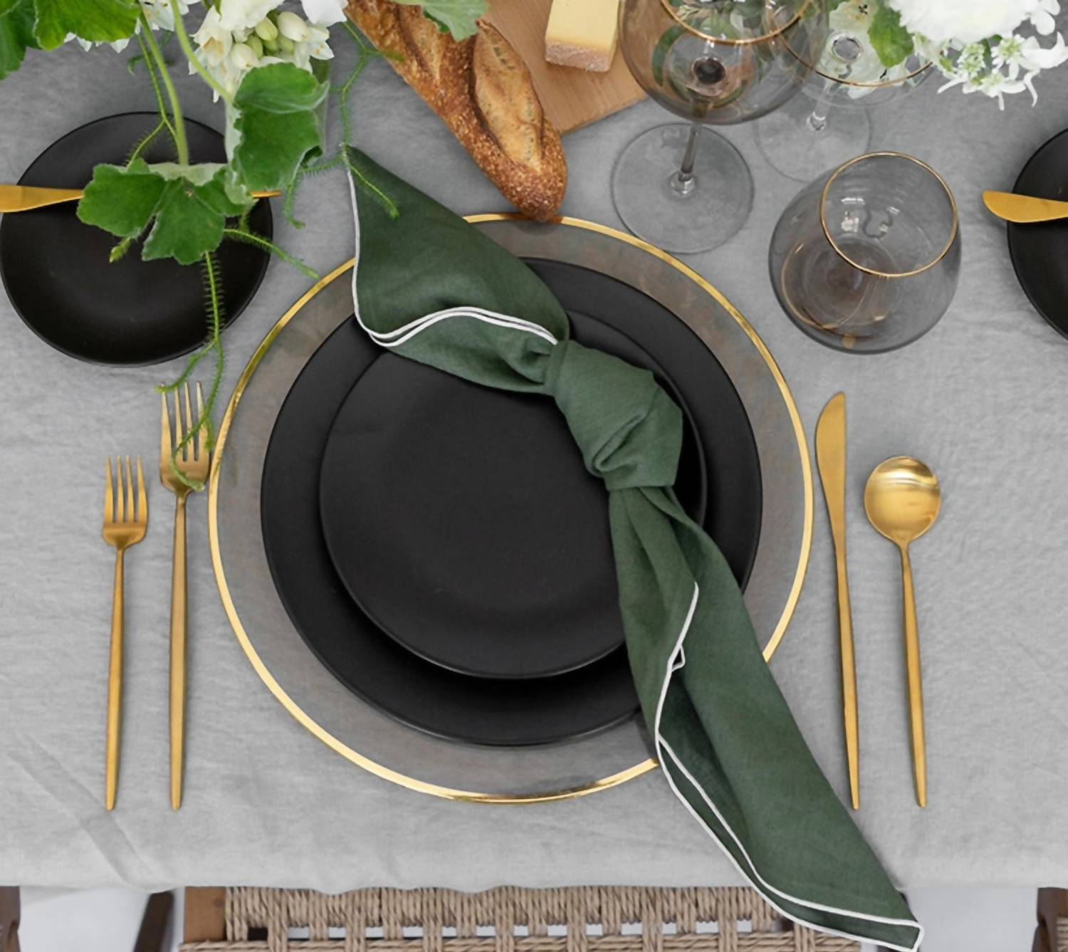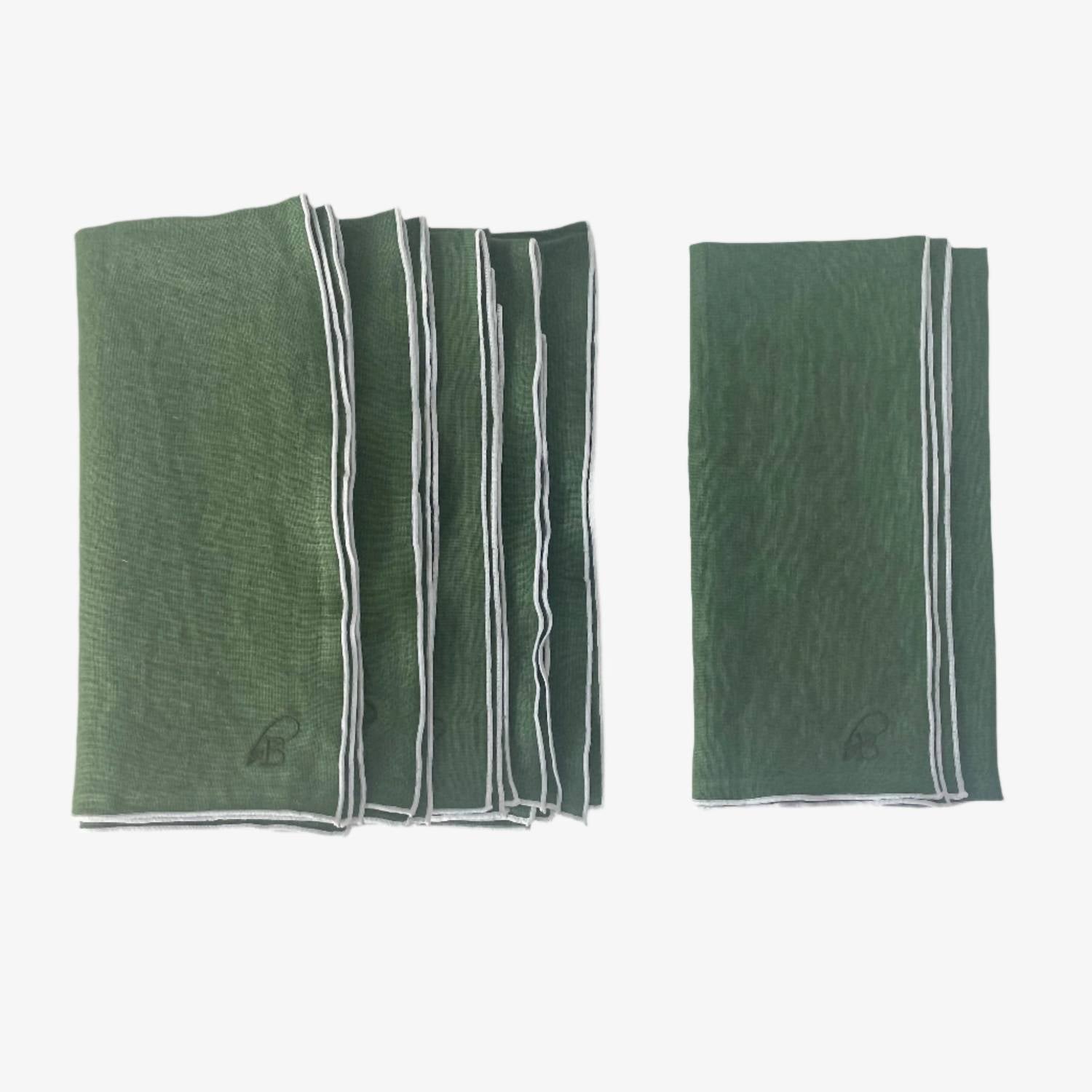 Experience the elegance of the Stone Washed Linen Napkins Set by borrowed BLU, offering a refined touch to your dining decor. Crafted from 100% pure flax linen with a luxurious feel, this set of four napkins features a beautiful contrasting surged stitch edge. Dimensions: 19" square. Care: Machine wash on a delicate cycle with cold or warm water, tumble dry low, and iron or steam to remove wrinkles. Available in versatile olive with white trim, perfect for any occasion from casual meals to sophisticated gatherings.