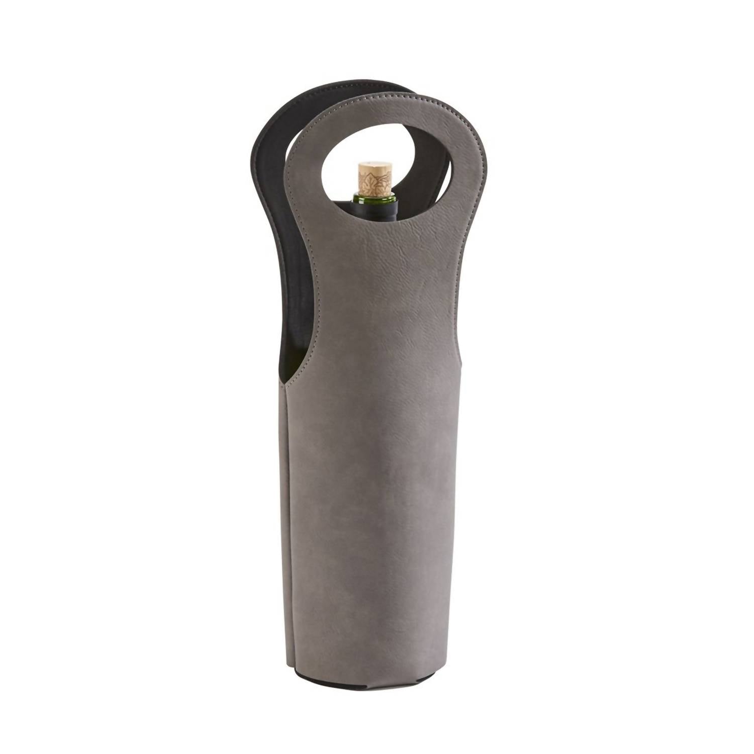 Presenting the Leatherette Wine Holder - 14.5" by Creative Gifts International, the epitome of stylish convenience for wine enthusiasts. Crafted from durable grey faux leather, this holder stands at 14.5 inches tall, perfectly accommodating various bottle sizes. Its sleek design allows for effortless access and an elegant display, making it perfect for any sophisticated gathering.