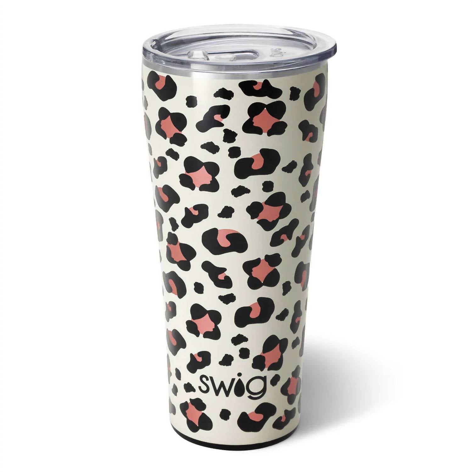 Introducing the Luxy Leopard Tumbler by Swig Life, an eye-catching piece in rose gold with sophisticated black spots. With a generous 32 oz. capacity, this tumbler provides ample space for your favorite beverages, reducing the need for frequent refills. Its slim profile ensures it's cup holder friendly and comfortable to hold. Perfect for style and convenience combined.