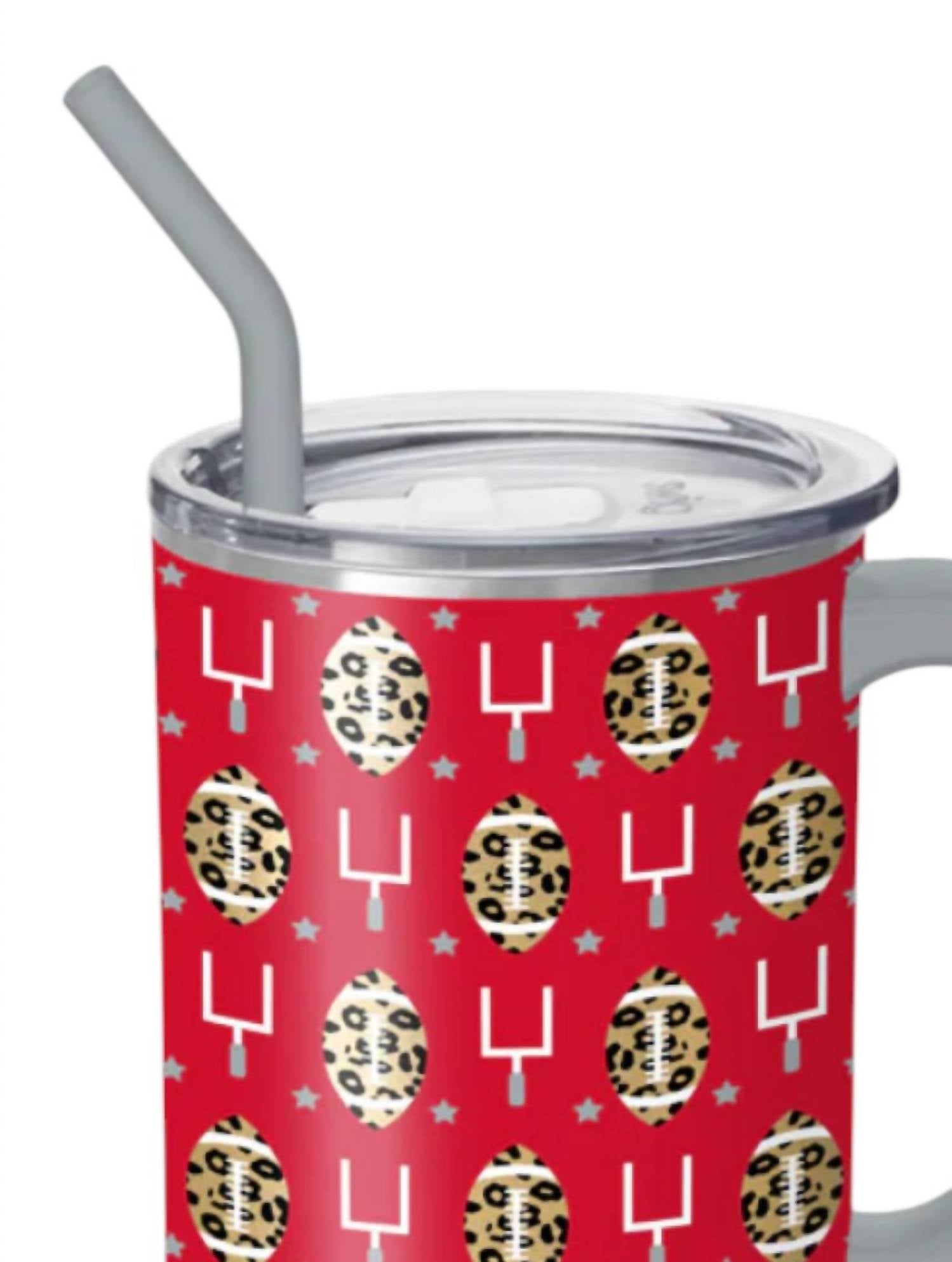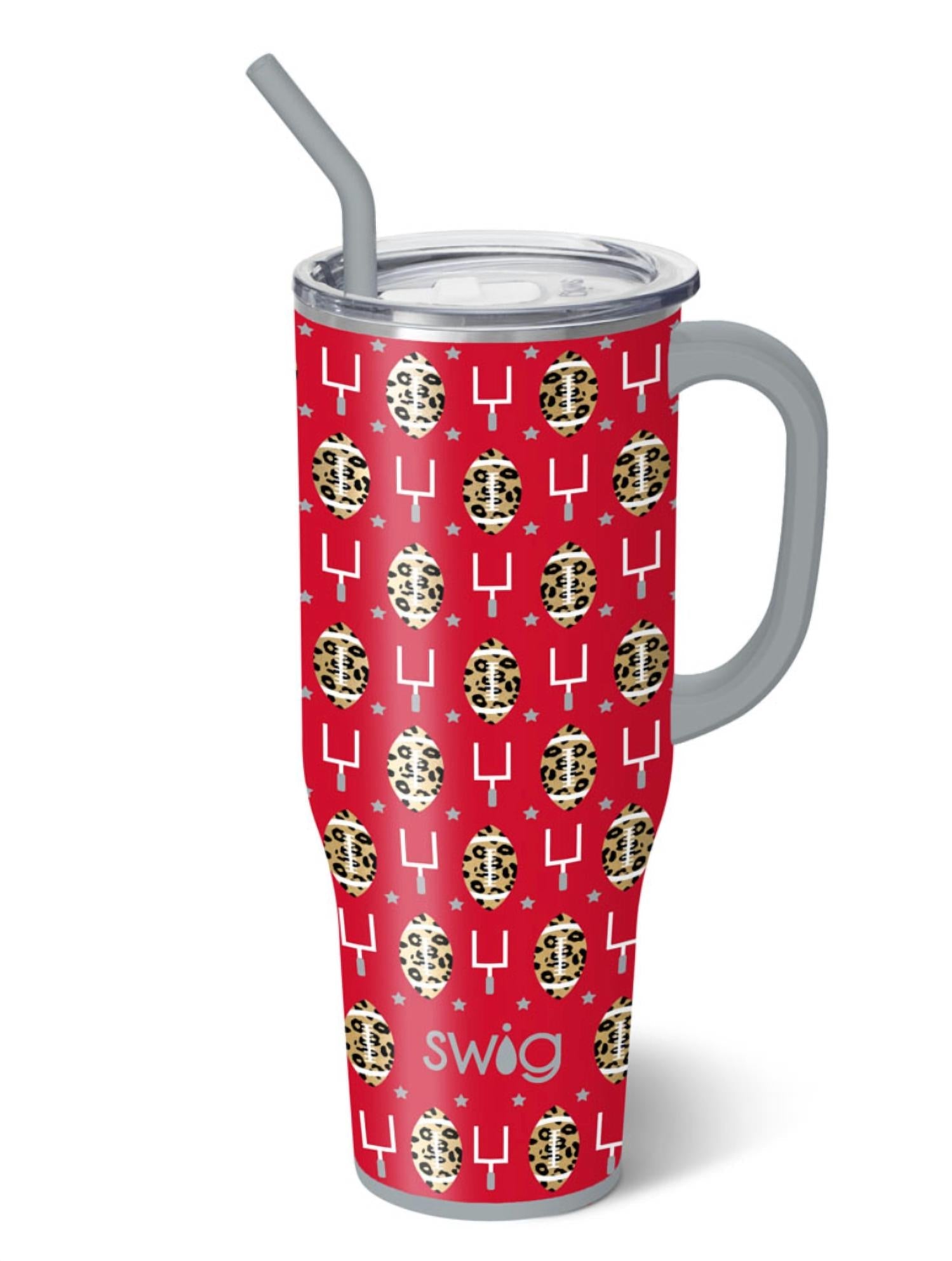 Introducing the Swig LIFE Football Touchdown Mega Mug, a game day essential in vibrant Touchdown Red and Grey. This 40oz mug, crafted from durable stainless steel, features a cup holder-friendly frame, a comfort-grip handle, and a flexi-tip straw with a standard plastic base. It's perfect for keeping your drinks cold for over 24 hours or hot for 9 hours. Enjoy effortless hydration with this must-have Swig accessory.