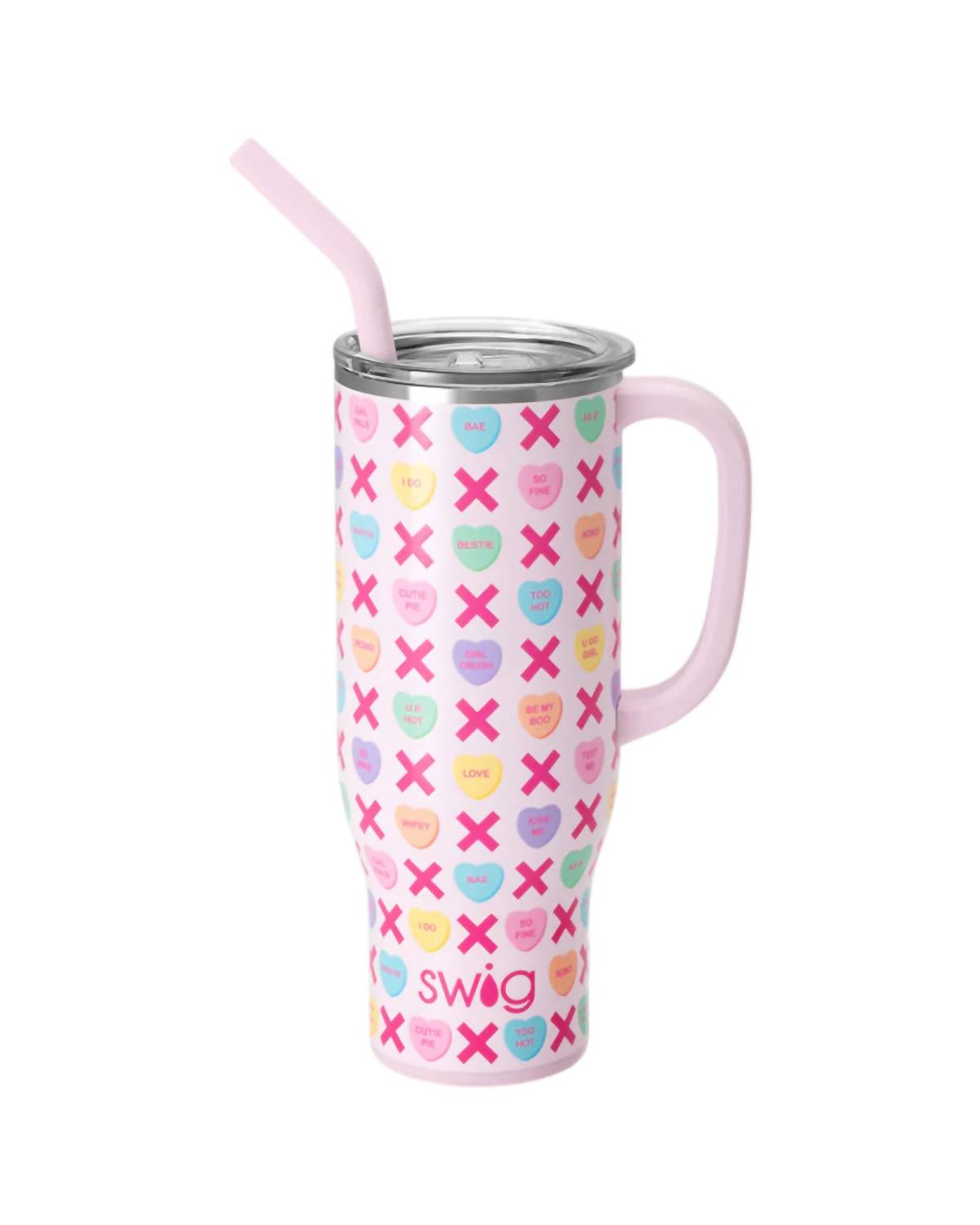 Stay stylishly hydrated with the Women's Be Mine Mega Mug by Swig Life, featuring a charming pastel candy conversational heart design on a glitter pink background. With a generous 30-ounce capacity, this mug is crafted from 304-18/8 stainless steel and incorporates triple-insulated technology to keep your beverage at the perfect temperature. At a height of 8.9 inches and width of 5 inches, it's designed for daily convenience. The mug includes a BPA-free plastic straw with a silicone flexi-tip and is top-rack dishwasher safe for effortless cleaning.