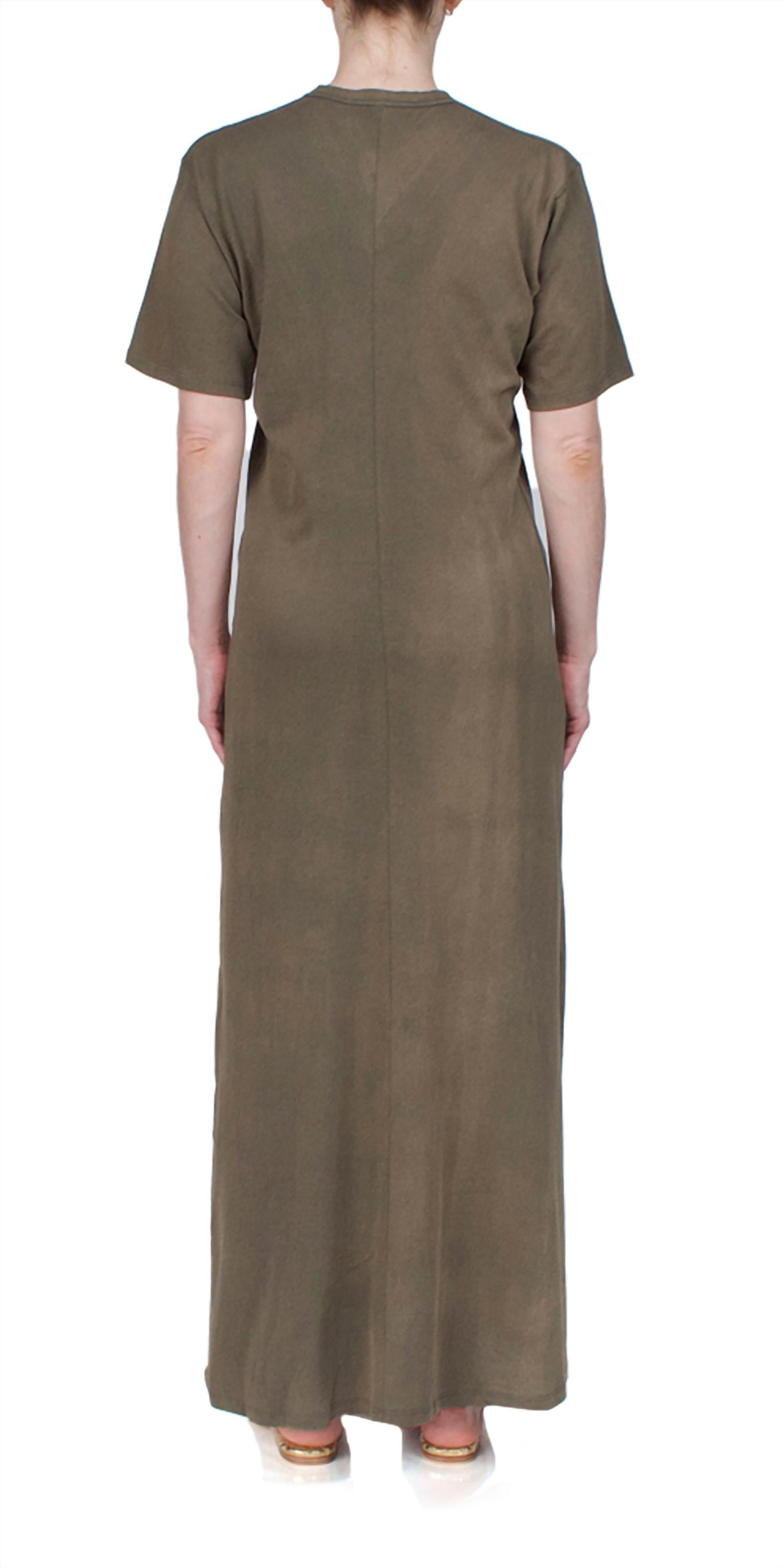 Elevate your casual wardrobe with the Women's Sunbleached Draped Dress by 6397, showcasing a blend of comfort and style. This Army Green t-shirt dress features elbow-length sleeves and is made from 100% cotton for a soft, breathable feel. Designed with a high crewneck and a dropped shoulder, this ankle-length dress offers a unique 'sunbleached' color variation. Closure: Pull on. Perfect for spring days, its tapered waist and shift silhouette flatter all body types. Model is 5'5" and wears a size XS.