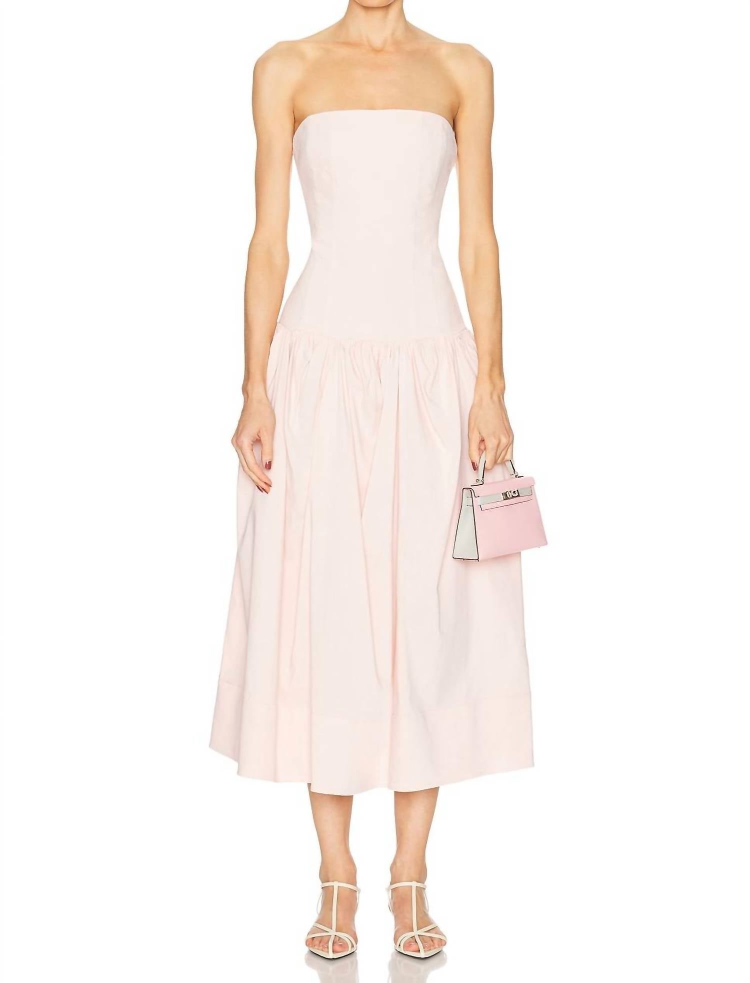 Introducing the A.L.C. June Midi Dress in an elegant Opal hue, an embodiment of minimalist sophistication. Crafted from a luxurious linen blend with 53% Linen, 44% Viscose, and 3% Elastane, this strapless A-line silhouette accentuates your figure effortlessly. Made in China, it features an off-the-shoulder neckline and a discreet side zipper closure for a seamless look. Suitable for spring evening events, this dress requires dry cleaning to maintain its pristine condition.