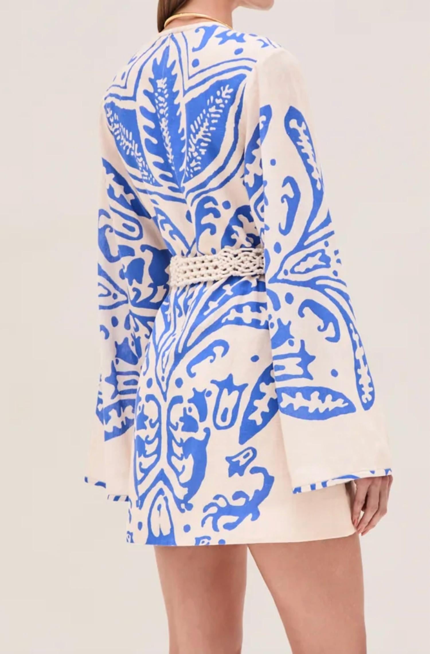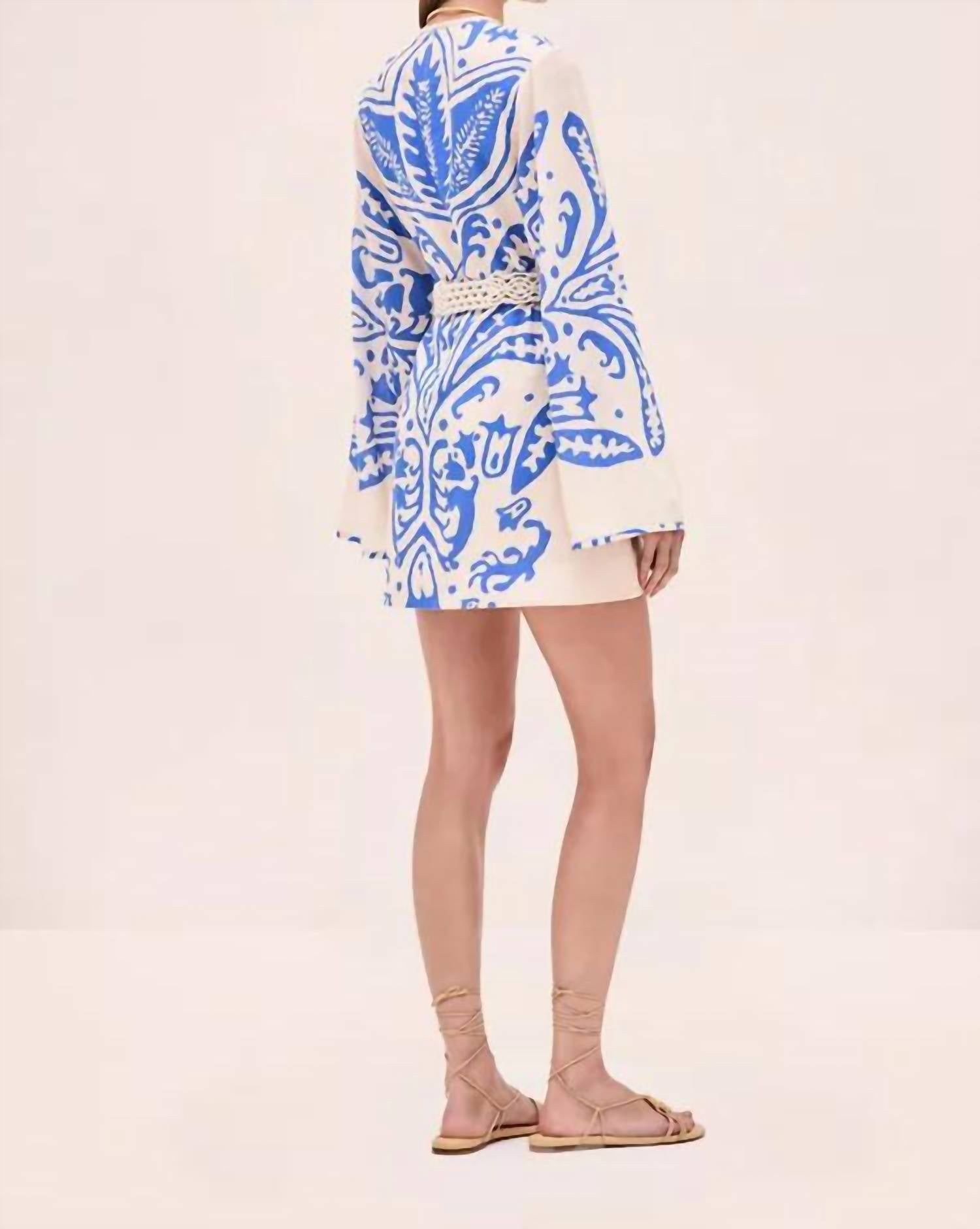 Introducing the Noriko Mini Dress by ALEXIS, a captivating piece in a sapphire palm print designed for boho chic appeal. This women's dress features long sleeves and a v-neckline, made from a cotton blend for comfort. The silhouette is a shift style, complete with a removable belt for versatile styling. Closure: Pull-on. Perfect for holiday parties or Thanksgiving gatherings.