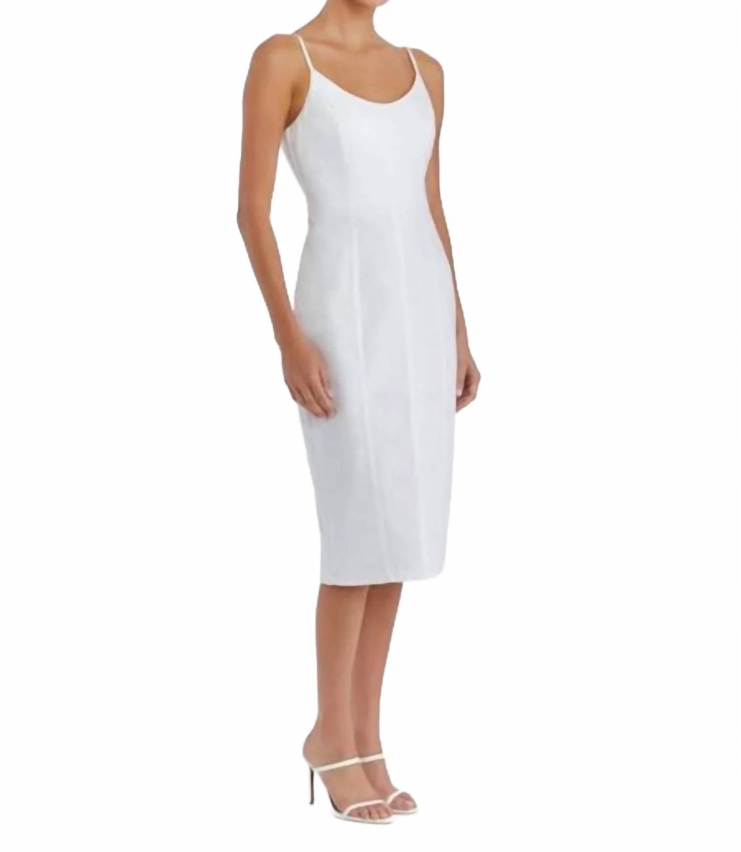 The perfect length dress does exist. The Rocco Midi Dress by Amanda Uprichard exudes elegance with its fitted silhouette and solid white wash color, perfect for summer weddings and Thanksgiving gatherings. This sheath dress features spaghetti straps and a scoop neckline, offering a refined and feminine touch. Crafted from pure cotton, it has a lined interior and secures with an invisible zip closure. Care instructions recommend machine washing for ease of maintenance.
