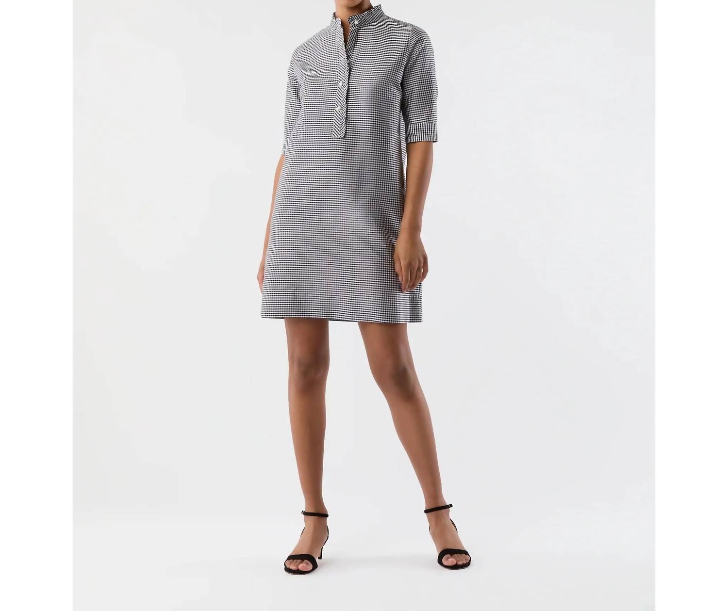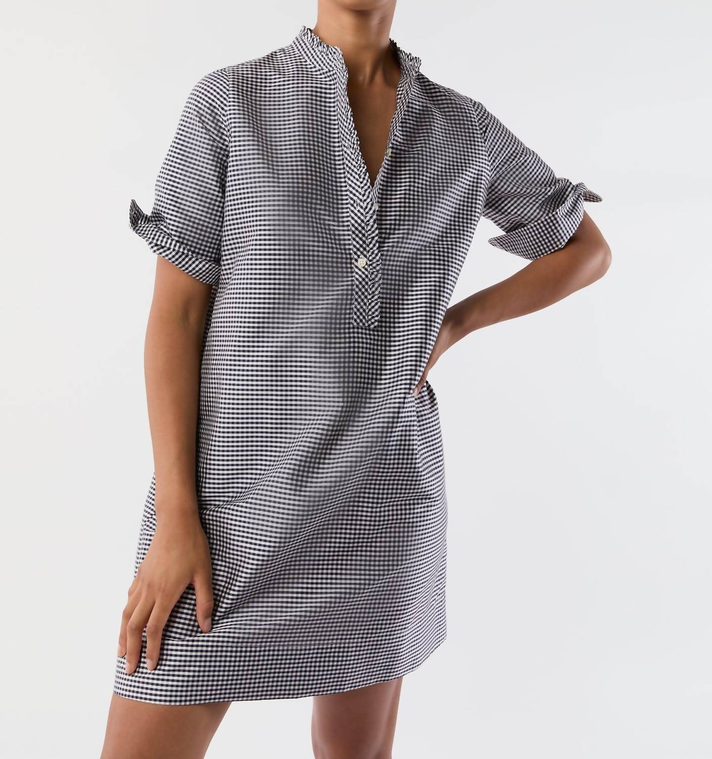 The kind of easy and flattering dress you'll be reaching for all season long. Ann Mashburn presents the Elbow Sleeve Frill Dress, a sophisticated choice for any wardrobe. Crafted from 100% Silk Shantung in a navy and ivory small gingham pattern, this mini dress is designed with elbow-length sleeves and a shift silhouette. Made in China, it features a mockneck, a popover placket with Trocas shell buttons, and on-seam pockets, with the hem adjustably extendable up to 2.5 inches. Ensure its longevity with dry clean care, making it perfect for spring occasions like Mother's Day or church gatherings.
