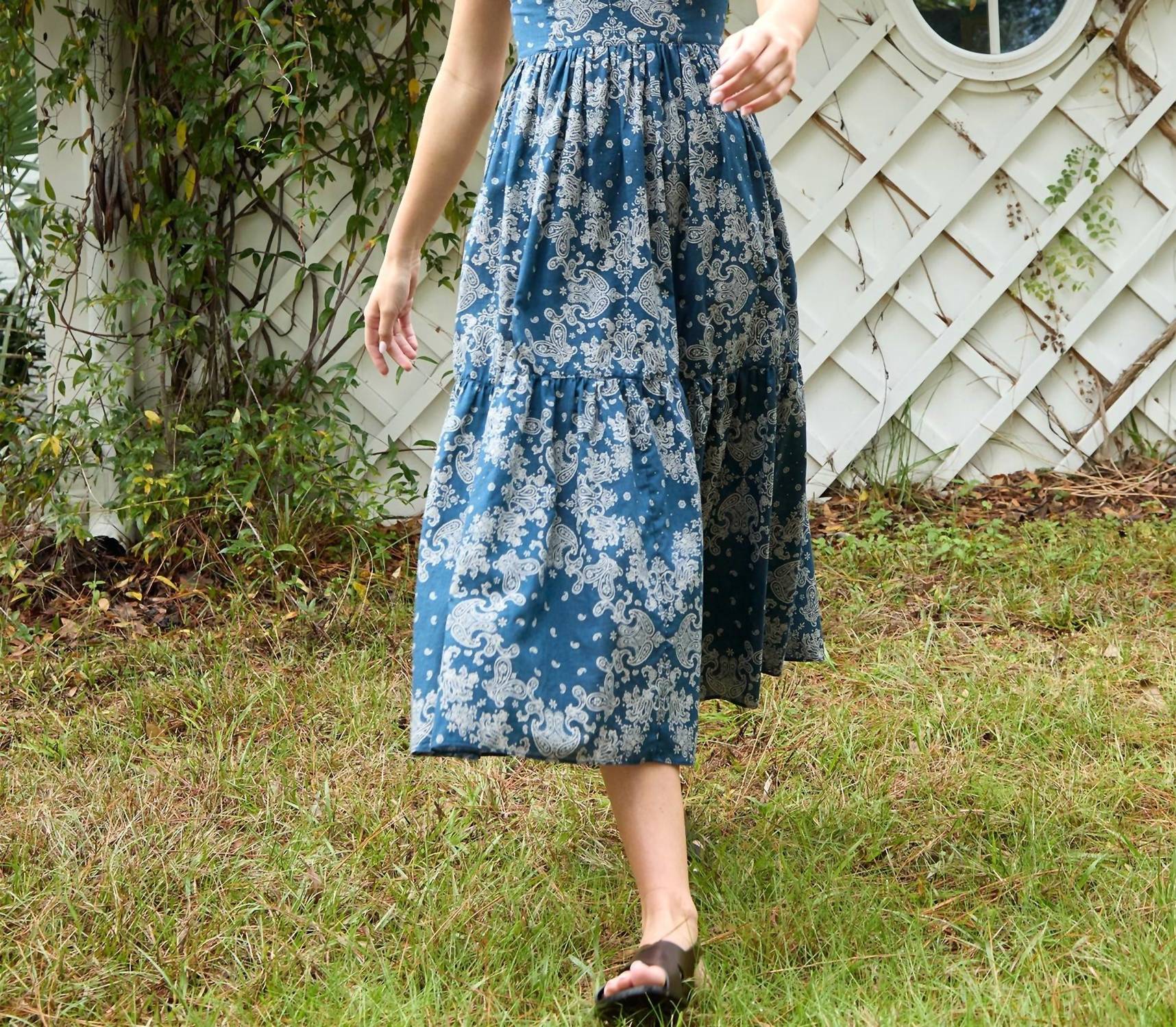 Pair with your favorite sandals for an effortlessly chic look. Introducing the Penny Bandana Dress by Ann Mashburn, an enchanting piece perfect for a boho-chic summer look. This sleeveless dress is crafted from 100% Japanese cotton lawn, featuring a delicate indigo floral pattern and designed with adjustable straps adorned with mother-of-pearl buttons. It comes with a tiered A-line silhouette and convenient on-seam side pockets, providing both style and functionality. Made in China, it features a concealed side zip closure for easy wear and is recommended to hand wash cold, line dry, and avoid tumble drying or bleaching for best care.