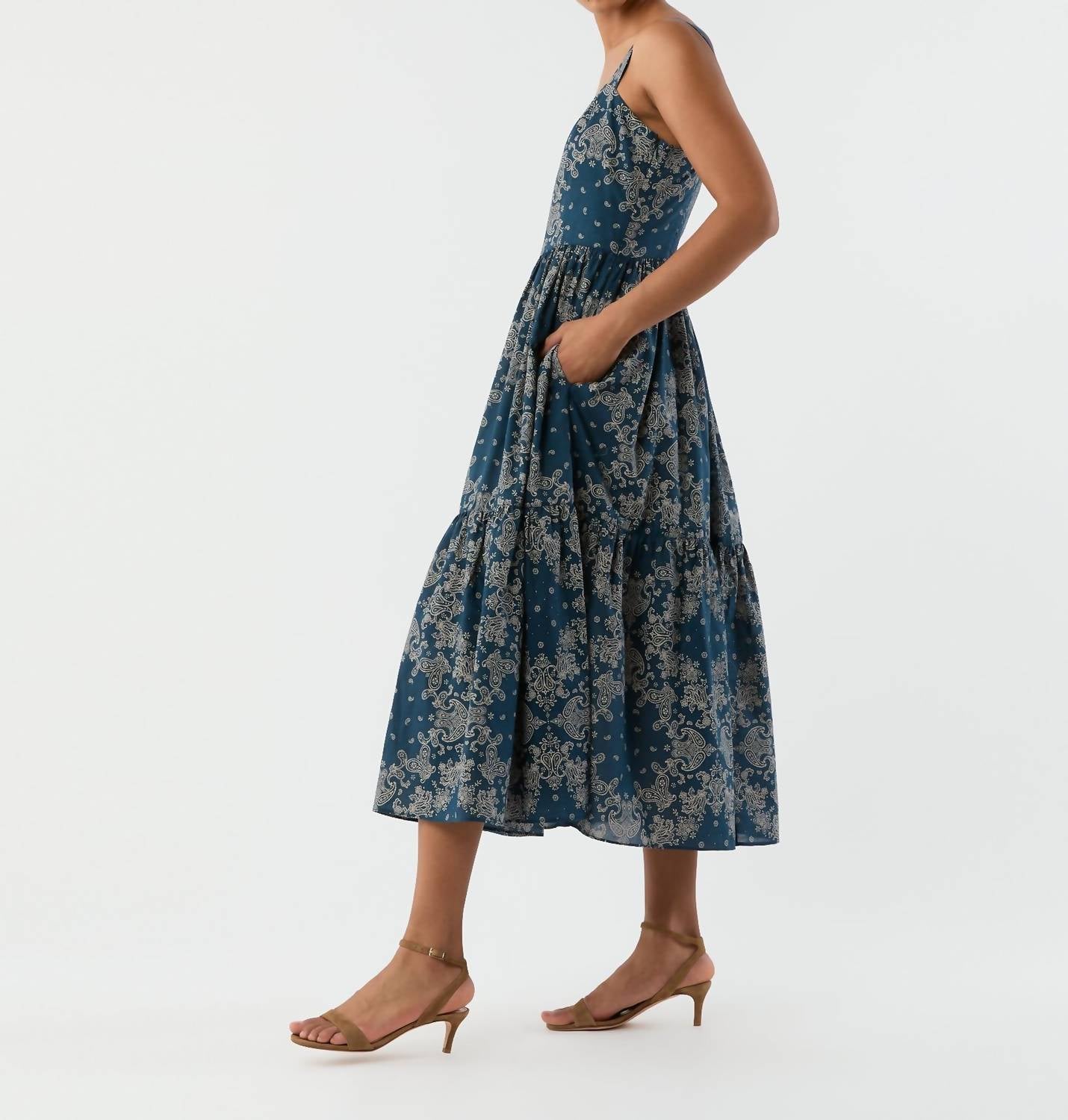 Introducing the Penny Bandana Dress by Ann Mashburn, an enchanting piece perfect for a boho-chic summer look. This sleeveless dress is crafted from 100% Japanese cotton lawn, featuring a delicate indigo floral pattern and designed with adjustable straps adorned with mother-of-pearl buttons. It comes with a tiered A-line silhouette and convenient on-seam side pockets, providing both style and functionality. Made in China, it features a concealed side zip closure for easy wear and is recommended to hand wash cold, line dry, and avoid tumble drying or bleaching for best care.