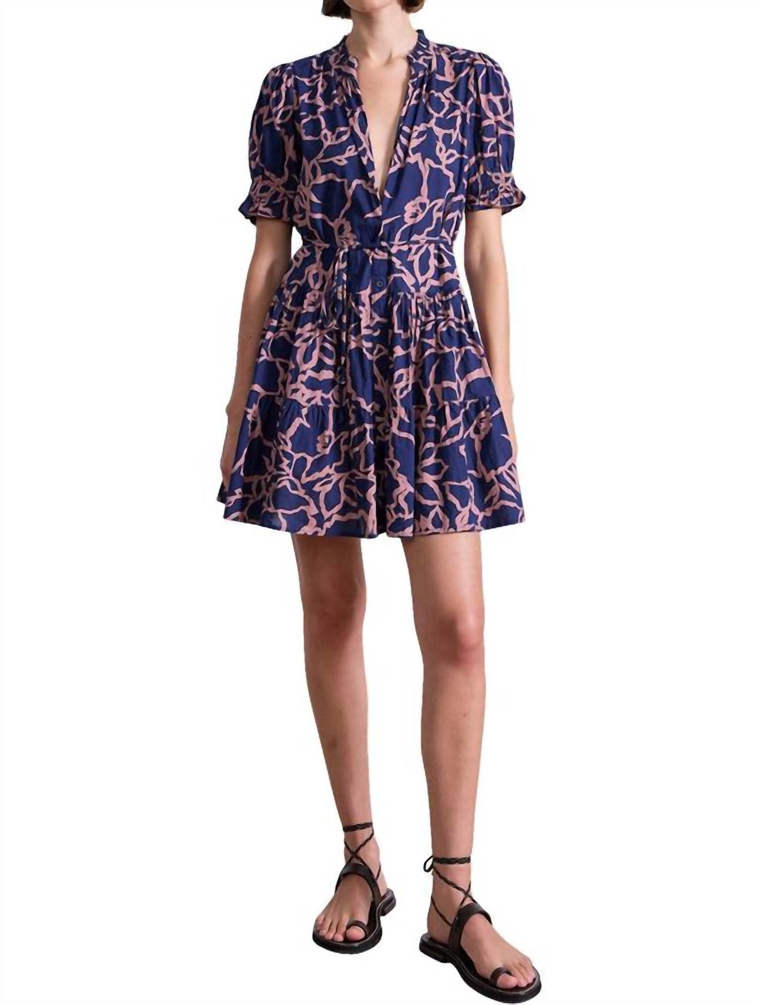 Introducing the Las Almas Dress by APIECE APART, a stunning mini dress in Lace Floral Navy perfect for a dinner party. Featuring short sleeves and a flattering V-neck, this dress is crafted from 100% organic cotton for a natural feel. The self-tie waist offers a customizable fit, complemented by a button closure for effortless wearing. Care instructions include hand washing to keep your piece looking its best.
