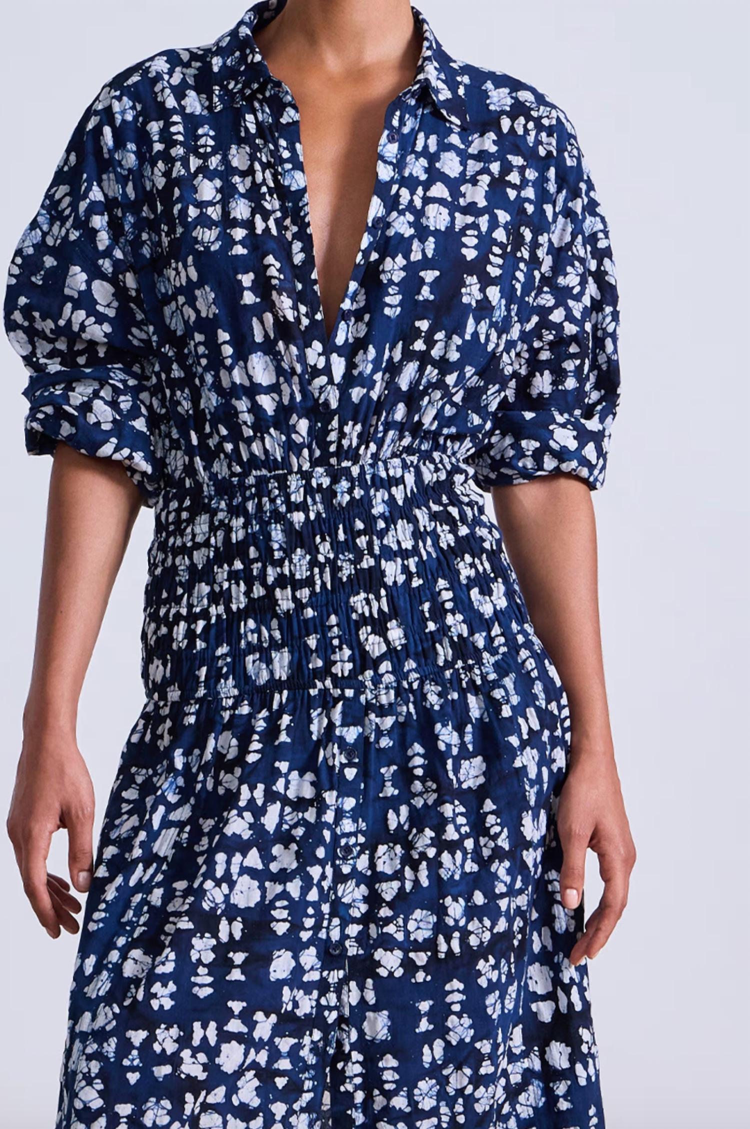 The Sophia Smocked Shirt Dress by APIECE APART in Batik Geo Indigo is a testament to artisanal craftsmanship. With short sleeves and a length of 52 inches from the shoulder, this dress is made entirely of 100% organic cotton. Expertly crafted in India, it features a dropped shoulder, a shirt collar, and an elastic smocked waist that cascades into a soft A-line silhouette. Closure is achieved with a front button placket, while care instructions suggest dry cleaning only. Unique due to its tie-dye and batik techniques, this garment's color and artwork variation should be embraced. Model is 5'10" and wears a size small.