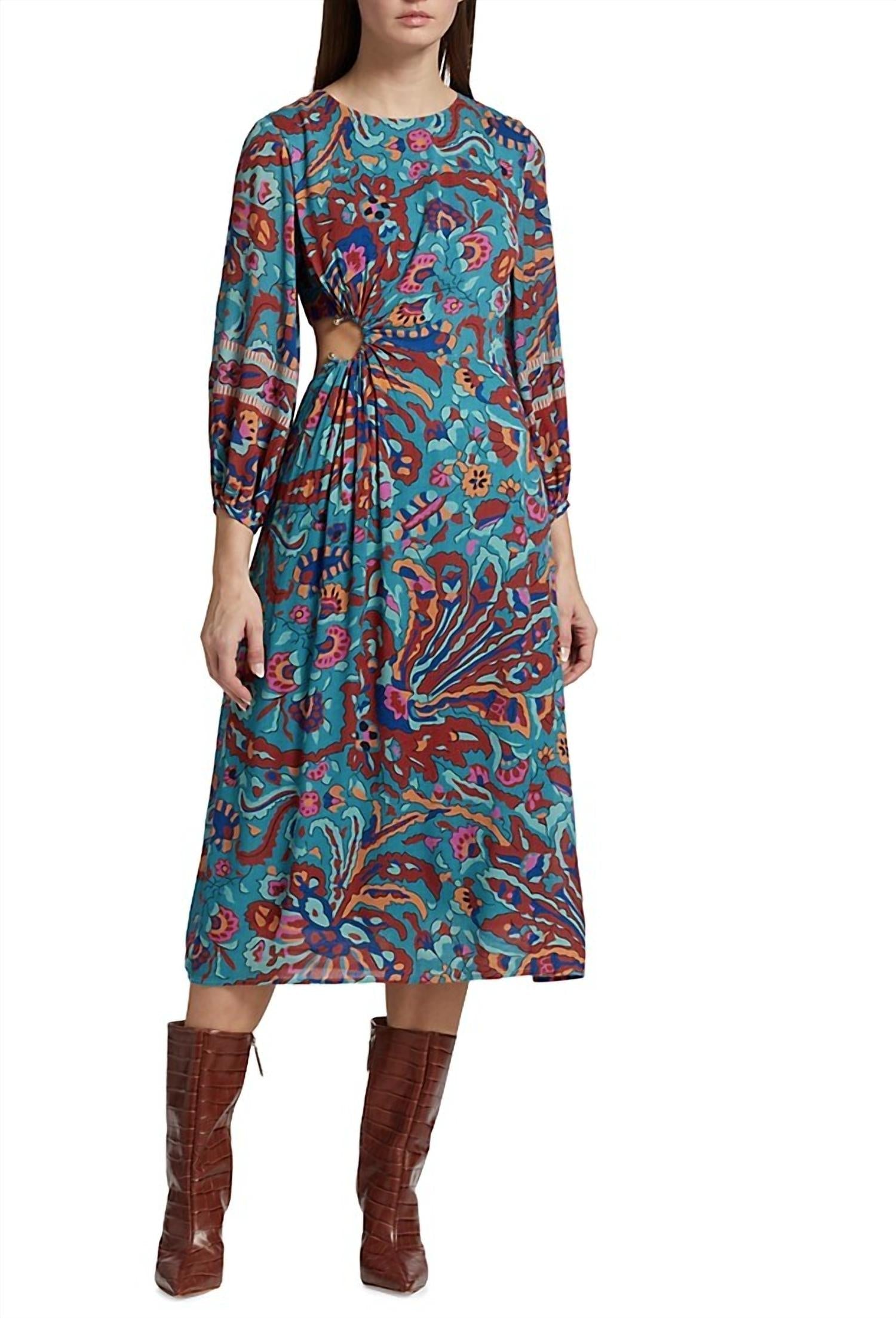 A midi dress so versatile, your options for wearing it are endless.A chic and modern piece, perfect for adding a touch of sophistication to your wardrobe. With its elegant round neck and bracelet-length sleeves, it features stylish side cutouts with a ring detail that gives it a unique flair. The back-button keyhole closure adds a subtle, polished touch to the look. 100% Viscose. Hand wash.