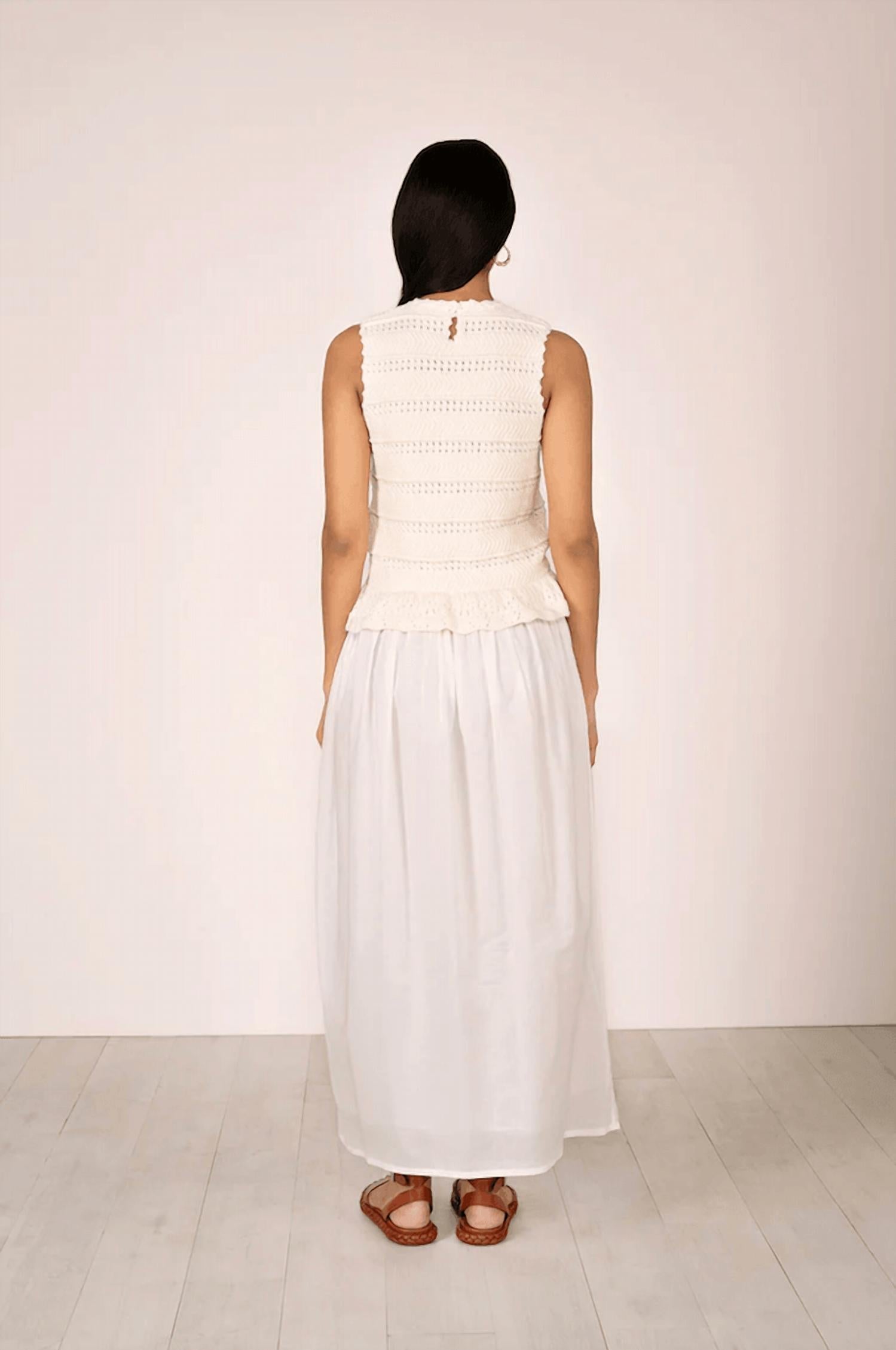 The Women's Banjanan Heather Crochet Dress in cream by BANJANAN exudes boho chic elegance perfect for vacation wear. This sleeveless maxi dress is crafted from 100% cotton with a captivating textured pattern, featuring hand-crocheted details that add both structure and charm to an A-line silhouette. Its key features include a scoop neckline and a button closure at the back, seamlessly blending practicality with style. Care instructions are hand wash cold and lay flat to dry, ensuring the delicate craftsmanship is preserved.