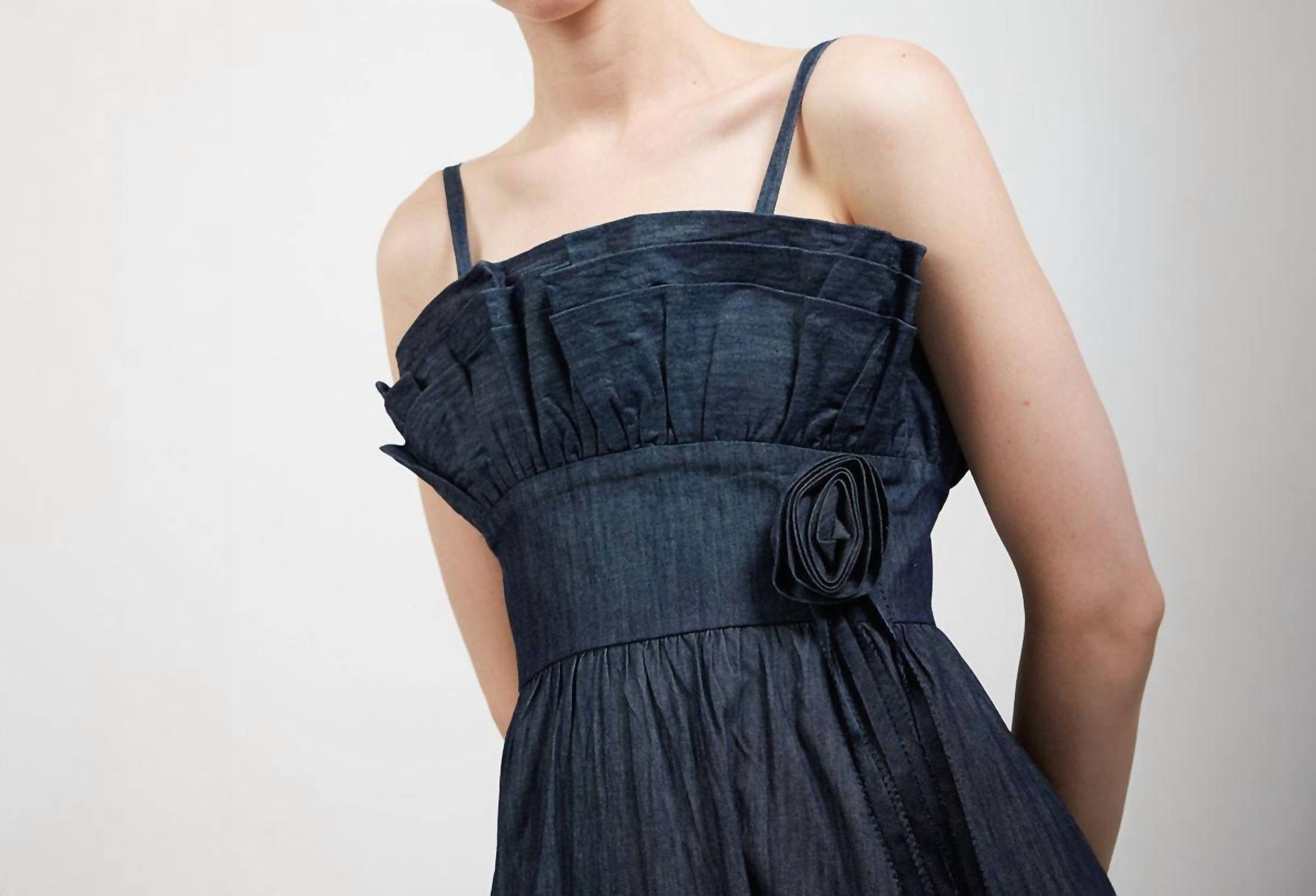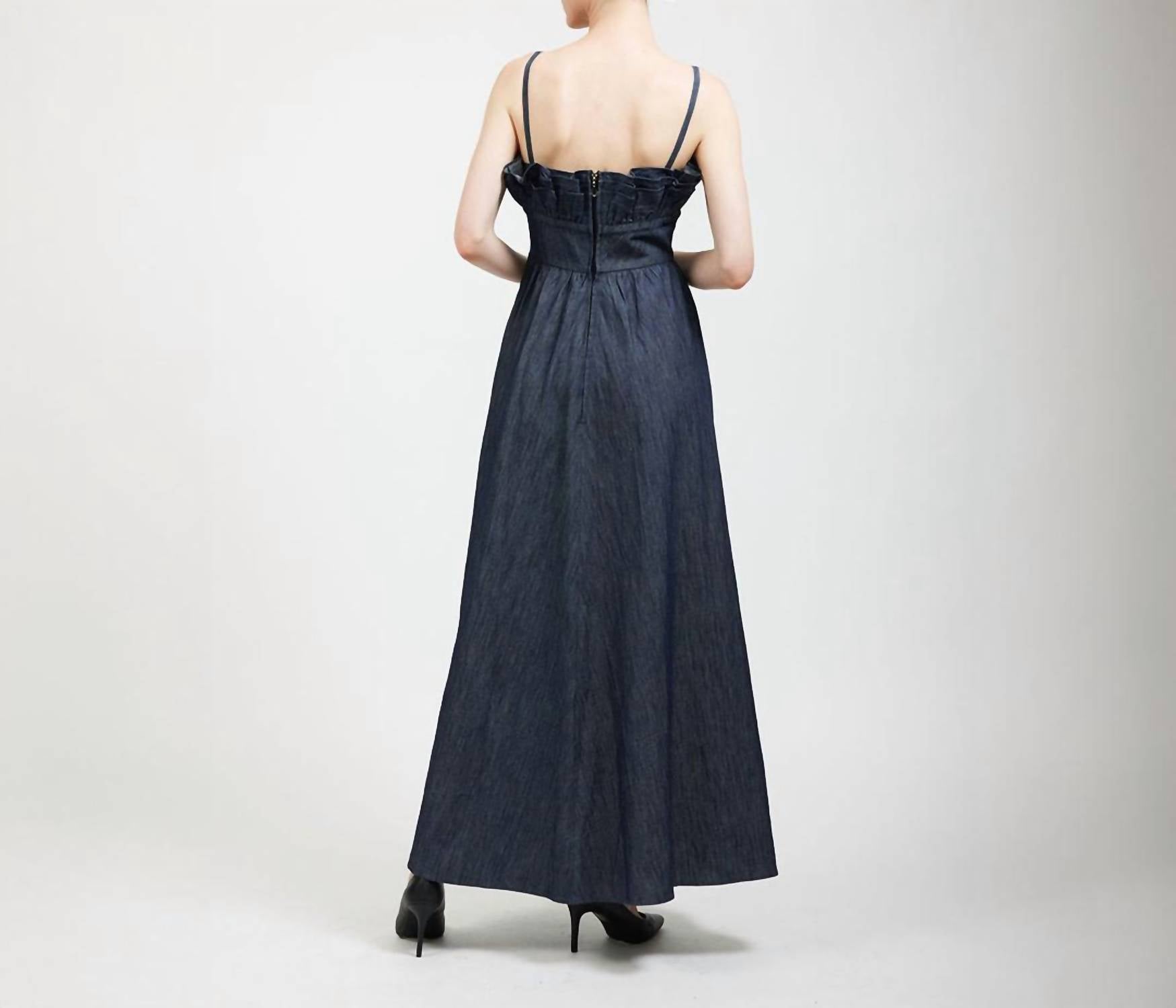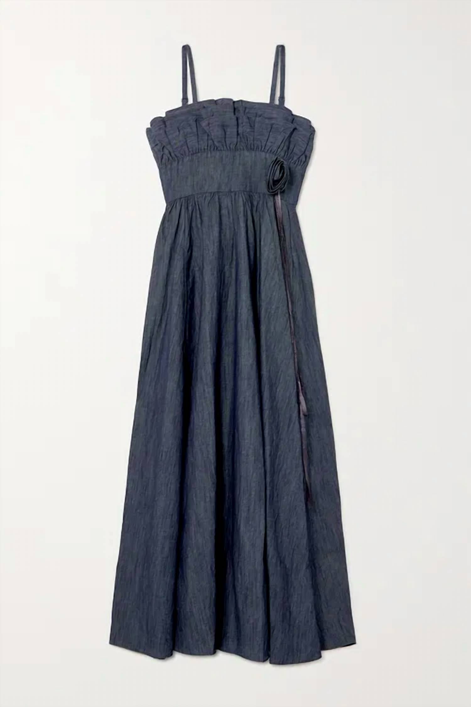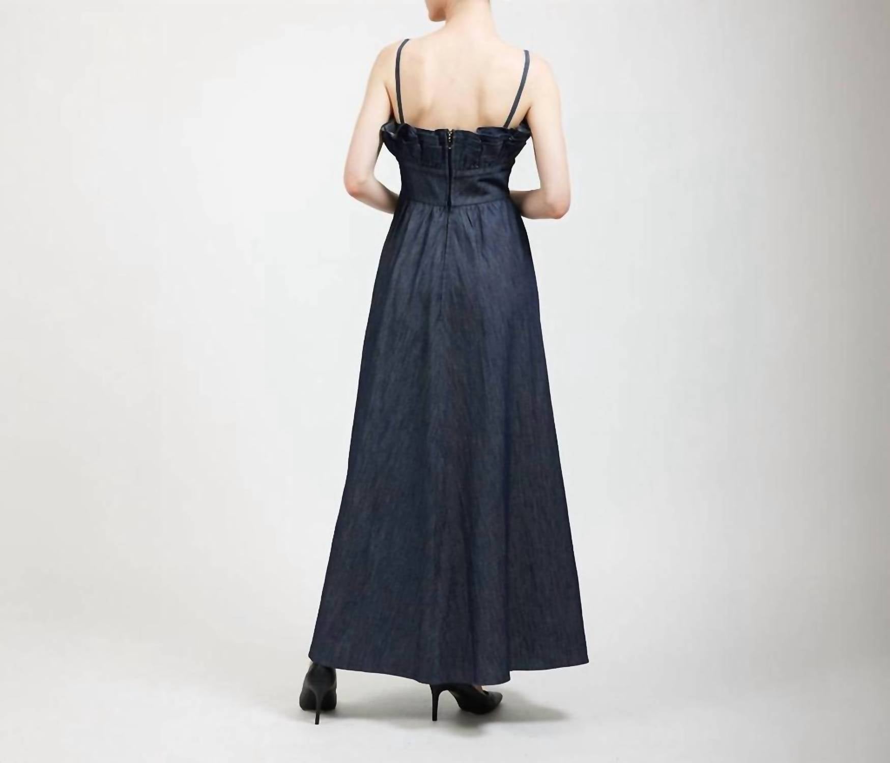 Style this maxi with your favorite statement necklace and sandals for the perfect look. Introducing the Batsheva Bow Amara Dress, a stylish maxi crafted for the modern woman. This elegant A-line silhouette in textured grey denim features chic spaghetti straps and a flattering squareneck, enhanced by a triple ruffled bodice and a sweet rose corsage at the waist. Composition: 100% Cotton. Closure: Zip closure. Perfect for dinner parties, this dress is a sophisticated addition to any fashion-forward wardrobe.
