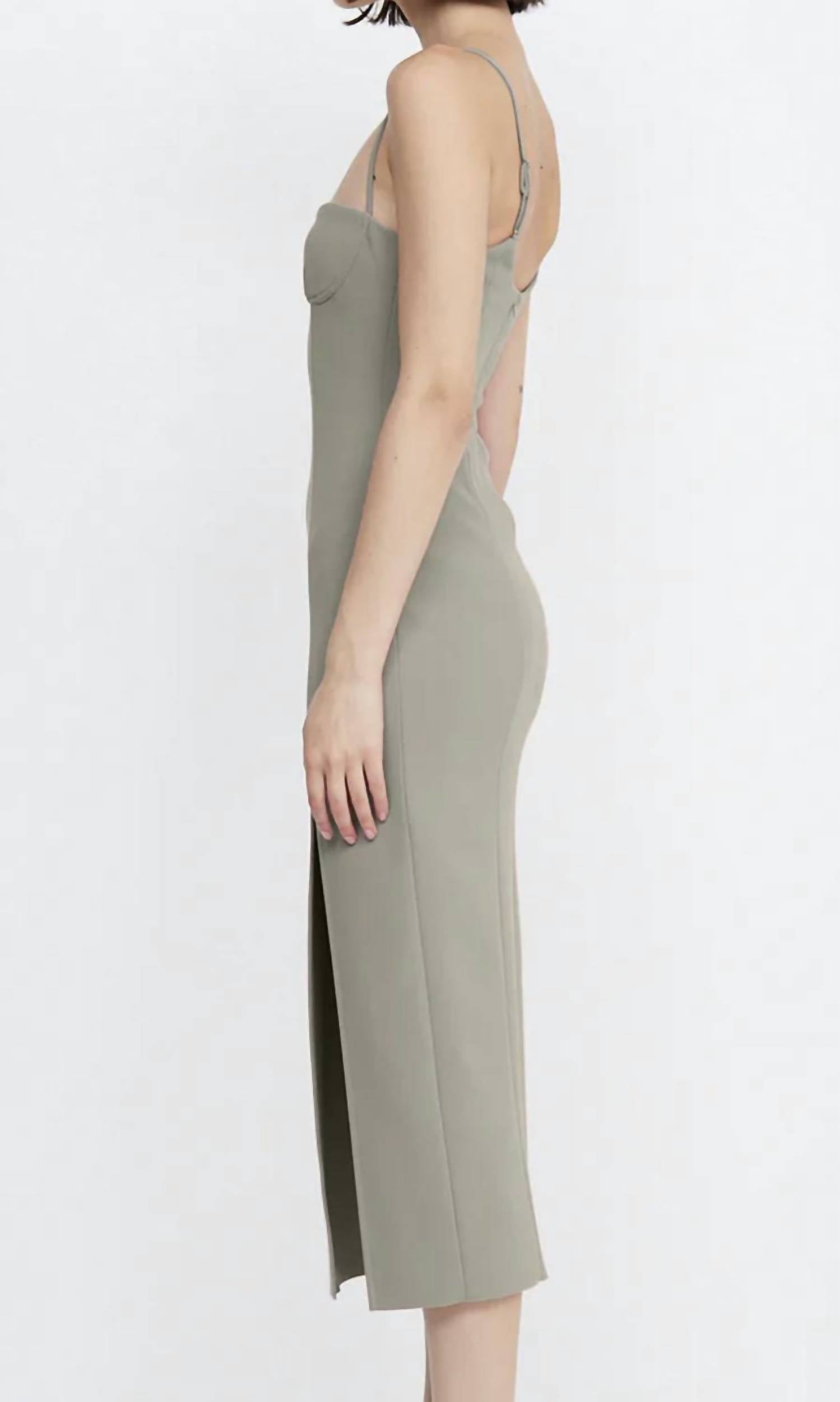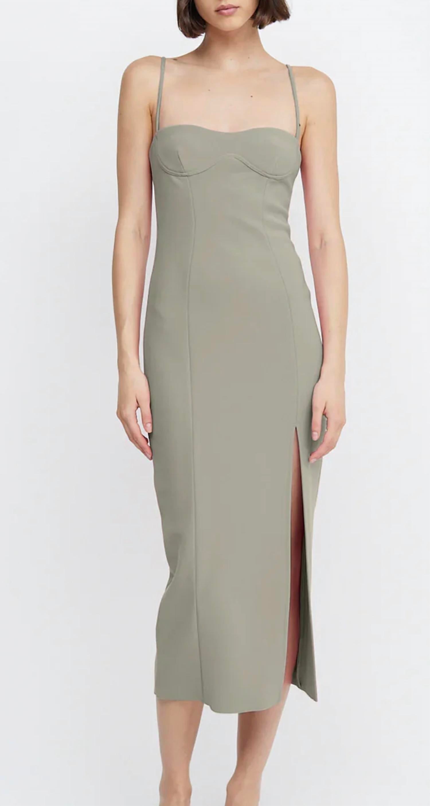 A figure hugging design with a slight sweetheart neckline, the Marisol Midi Dress is cut from our signature stretch bonded crepe. The midi dress features a bias bind at the under bust, bust darts, shape seams throughout the body of the dress and a high front split. This garment is certified Australian made.