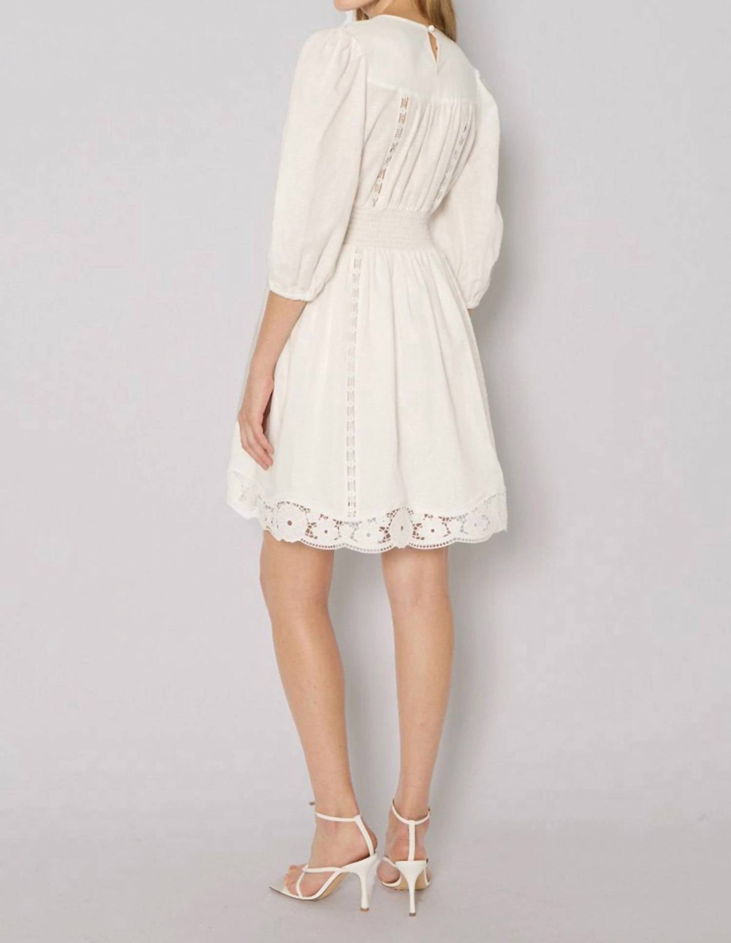Step into elegance with the Roodie Lace Embroidered Mini Dress by Berenice, a sublime addition to your spring wardrobe. This white mini dress features three-quarter sleeves and a flattering A-line silhouette, adorned with intricate lace embroidery for a refined look. Designed with a V-neck and button closure, its solid pattern is perfect for dinner parties or Thanksgiving gatherings. Made to impress, this must-have piece is recommended for dry cleaning only.