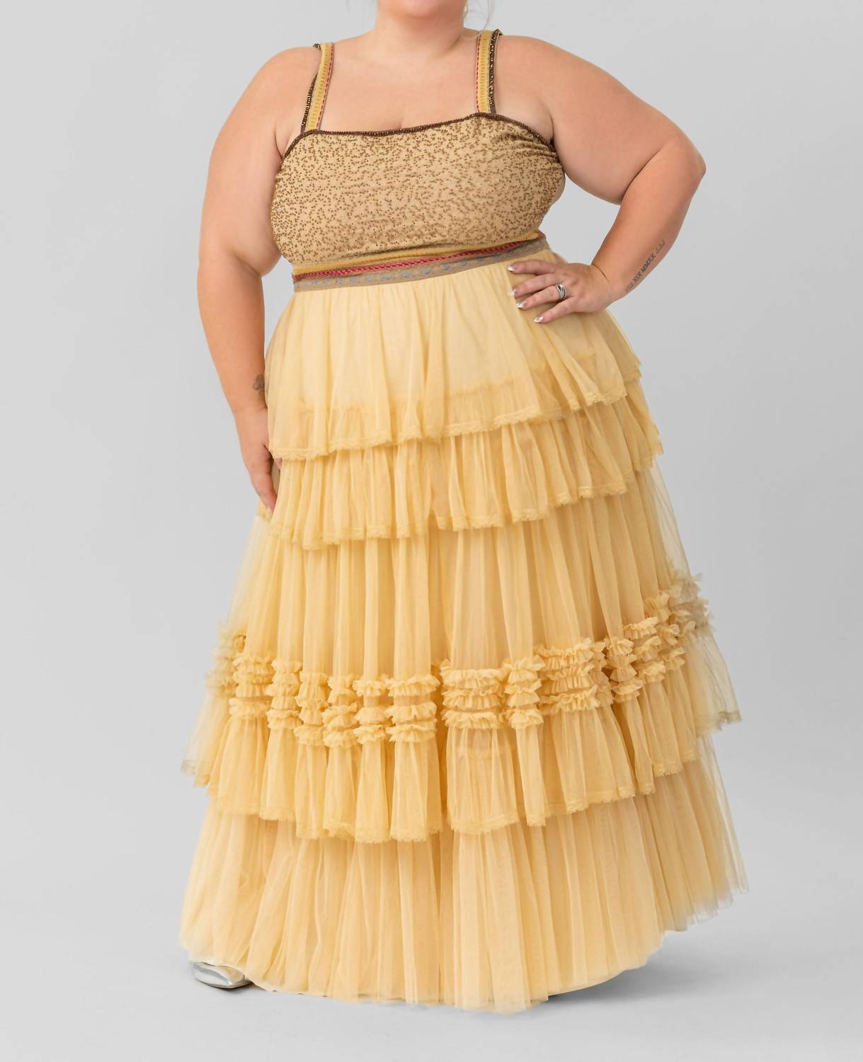 Introducing the Zeena Maxi Dress by -bl^nk-, a stunning piece in warm beige that's perfect for summer events. This plus-size dress features delicate spaghetti straps and a scoopneck to accentuate your décolletage, while the 40% Tulle, 60% Polyester material showcases ethereal elegance. With a pull-on closure, the A-line silhouette gracefully flows, capturing the essence of quiet luxury. Care instructions include machine wash and tumble dry, making it both beautiful and practical for an evening event.