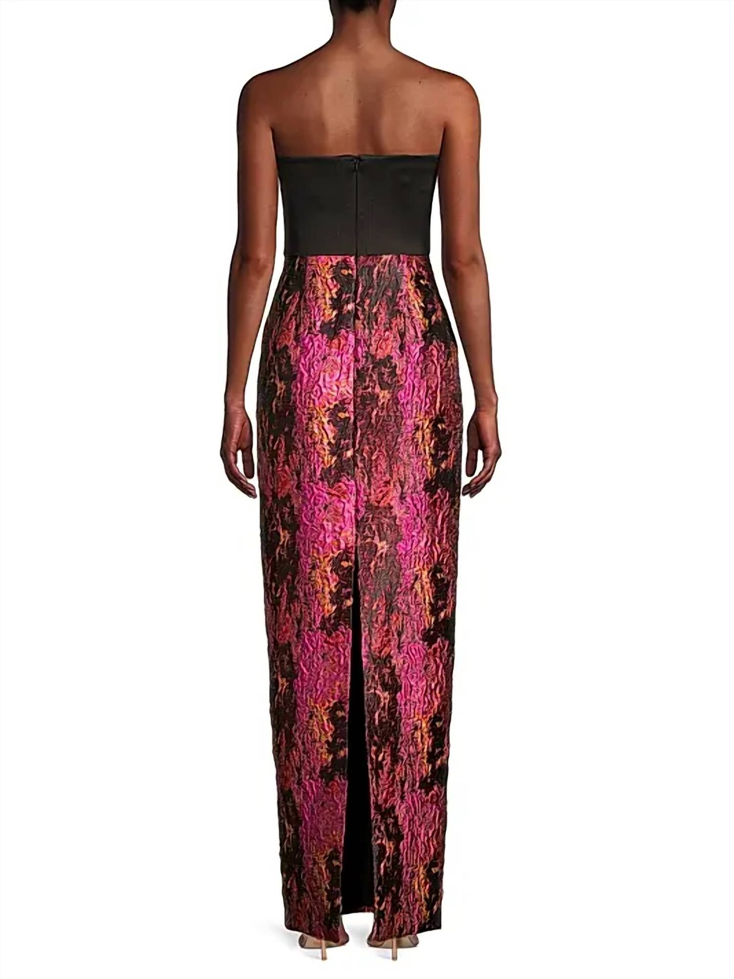 Introducing the Opal Storm Lumina Gown by Black Halo, an elegant choice for your next evening event. This strapless sheath gown, featuring a back slit, is crafted from abstract metallic jacquard for a textured finish. With a composition of 91% polyamide and 9% metallic fibers, and a comfortable lining of 96% polyamide and 4% spandex, it promises a sleek fit. Made in the USA, it features a zip closure and measures approximately 62” from shoulder to hem. Care instructions: Dry clean only. Model is 5'10" and wears a US size 4. Please note, this item runs small.