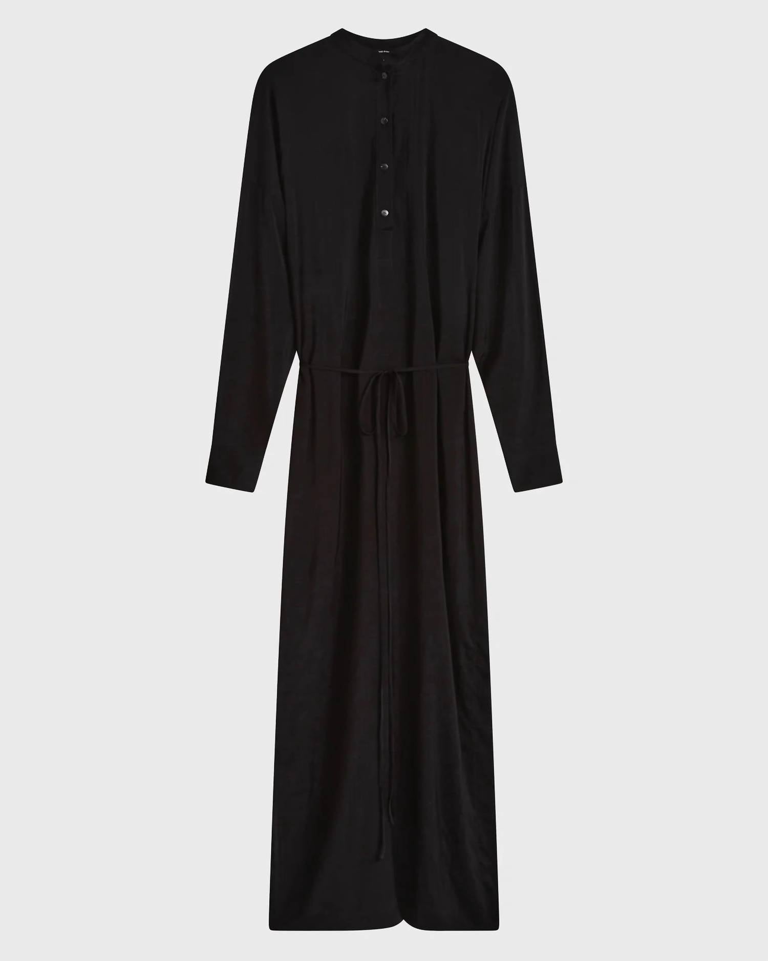 Presenting the Cremona Long Tunic Dress by BONDI BORN, an effortlessly chic caftan designed for sun-soaked days and elegant evenings. Crafted from a soft blend of 51% rayon and 49% viscose, this solid black maxi dress showcases long cuffed sleeves and a refined stand collar. The button-front detail adds sophistication while a waist tie enhances your silhouette, with side splits ensuring freedom of movement. Care for this tunic by cold gentle machine washing and line drying in the shade.