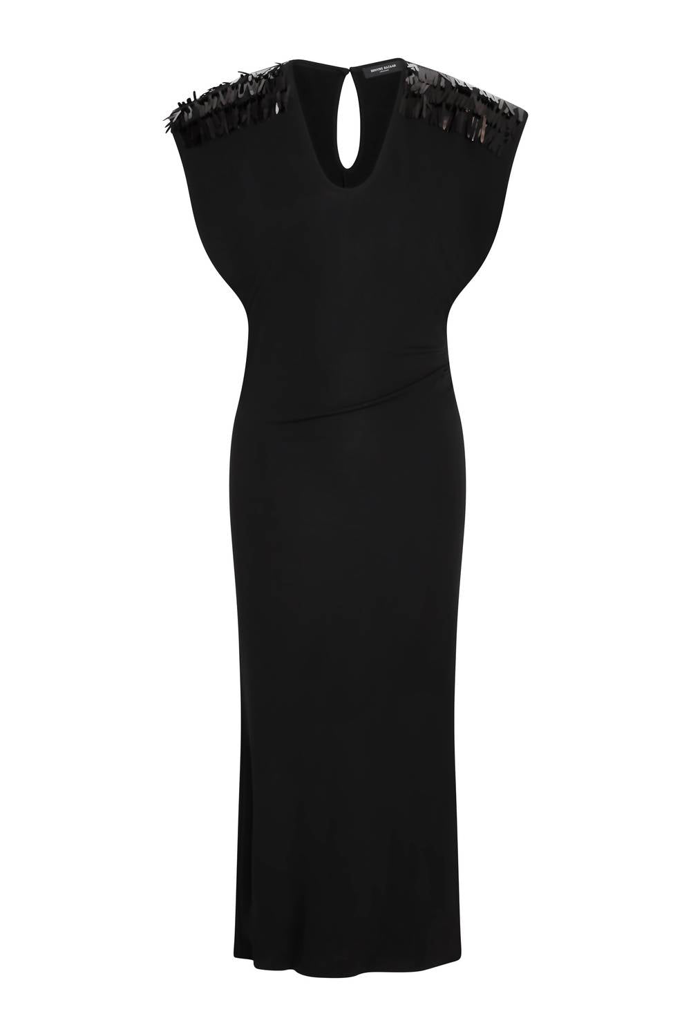 The kind of easy and flattering dress you'll be reaching for all season long. This elegant dress is crafted from 100% viscose, offering a soft, fluid drape with a refined, tailored fit that flatters the body. Designed with detailed shoulders, a back loop with button closure, and a subtle back slit, it’s perfect for festive occasions where a polished, eye-catching look is desired.