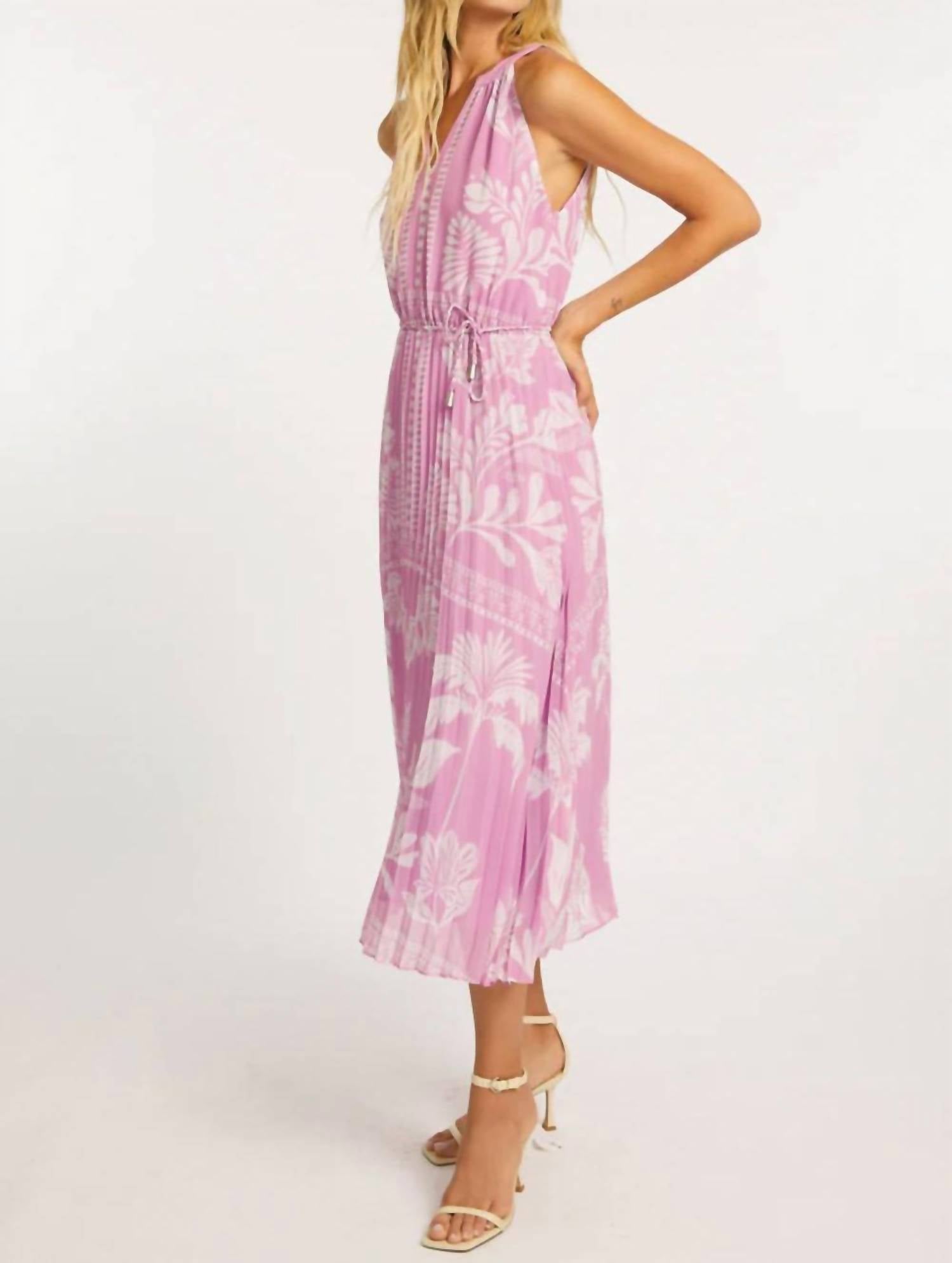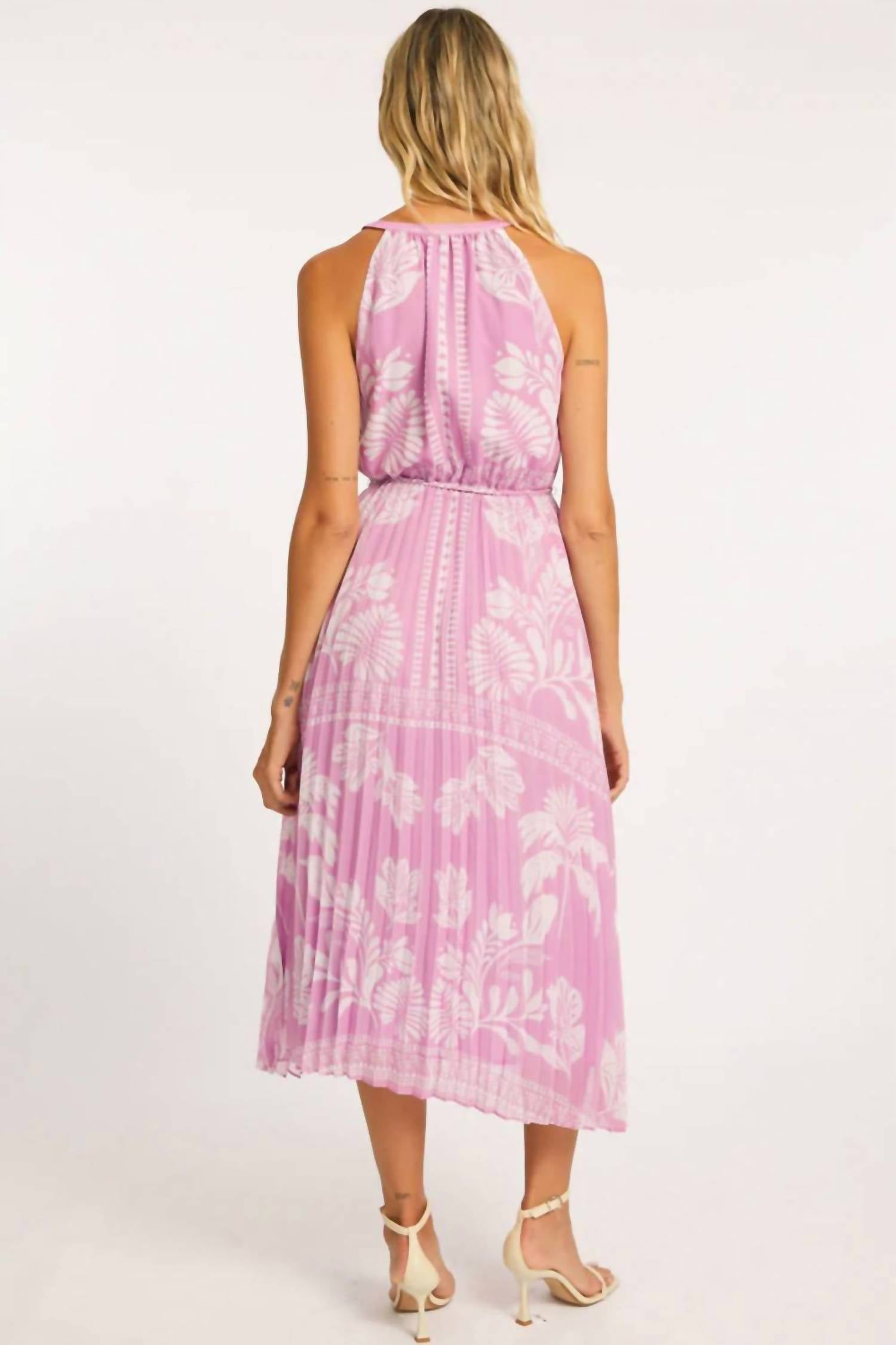 Just add slides or mules and you are good to go. Introducing the Nouvel Midi Dress by CABALLERO, a boho chic addition to your wardrobe in the vibrant Palm Serenade pattern. This sleeveless, A-line dress is crafted from 100% polyester, featuring a flattering V-neck with an elegant halter style alongside a comfortable elastic waist and flowing pleated skirt. The pull-on closure ensures easy wear for leisurely beach days or festive occasions. Care instructions include machine washing and tumble drying, making it a practical yet stylish choice for summer outings.