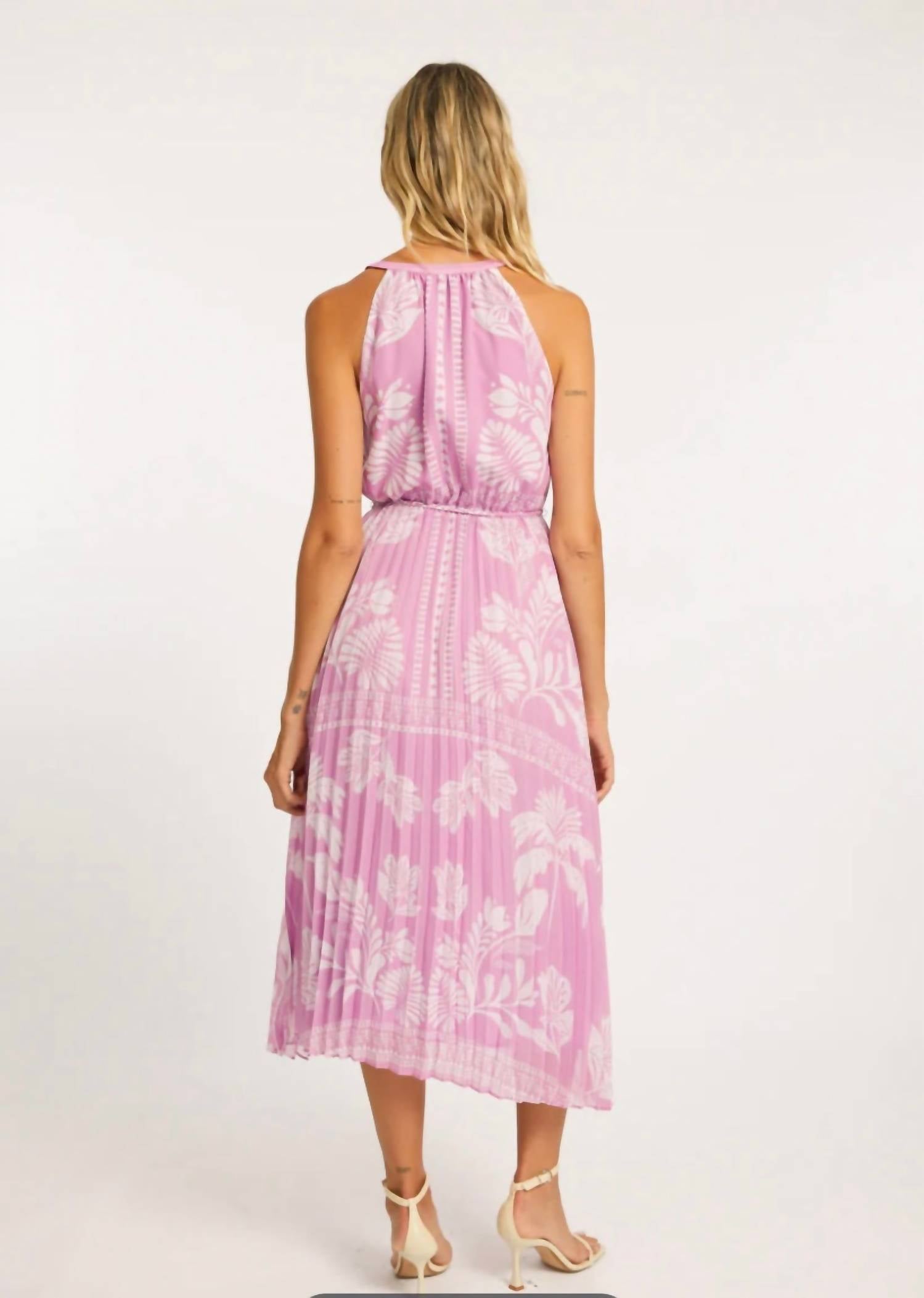 A midi dress so versatile, your options for wearing it are endless. Meet the Nouvel Palm Dress by CABALLERO, a captivating choice for your summer occasions with its boho chic floral pattern in a vibrant pink hue. This sleeveless dress boasts a halter style bodice with a flattering V-neckline, complemented by a midi-length A-line silhouette. Crafted from 100% Poly Chiffon, it features an elastic waist and a removable rope belt for a tailored fit, secured by a side seam zipper closure. Perfect for an Easter party or holiday gathering, the dress offers elegance and comfort without pockets.