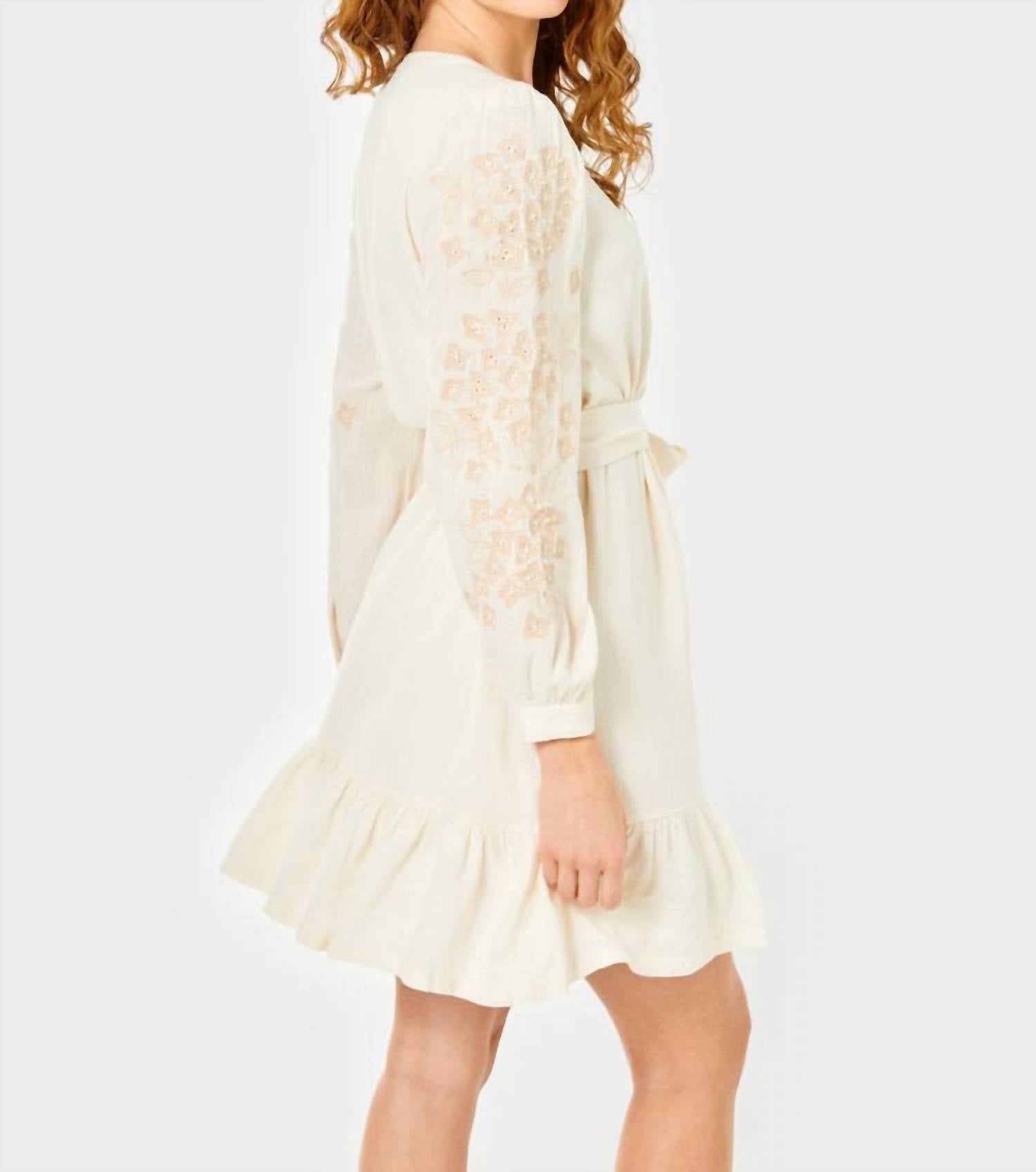 Experience timeless elegance with the Cartolina Nantucket Allyson Mini Dress, crafted in classic linen. This dress features long sleeves with button cuff details and a fit-and-flare silhouette highlighted by a flirty ruffle skirt hem. Adorned with hand-finished floral embroidery, it boasts a button front placket and a self-tie belt for a customizable fit. Care: Machine wash. Perfect for a sophisticated Thanksgiving dinner or any special occasion.